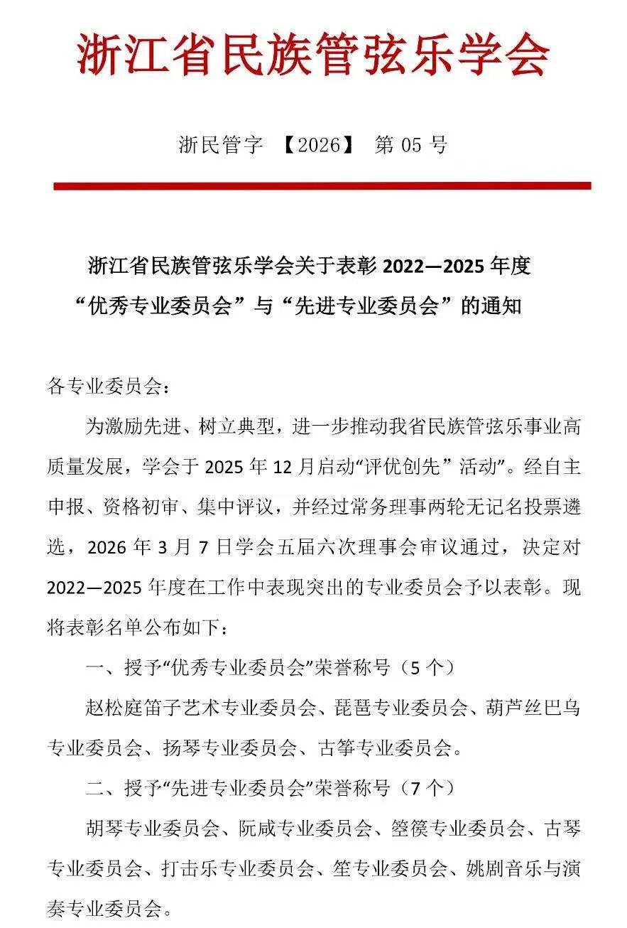 浙江省民族管弦乐学会赵松庭笛子艺术专业委员会荣获“优秀专业委员会”称号!