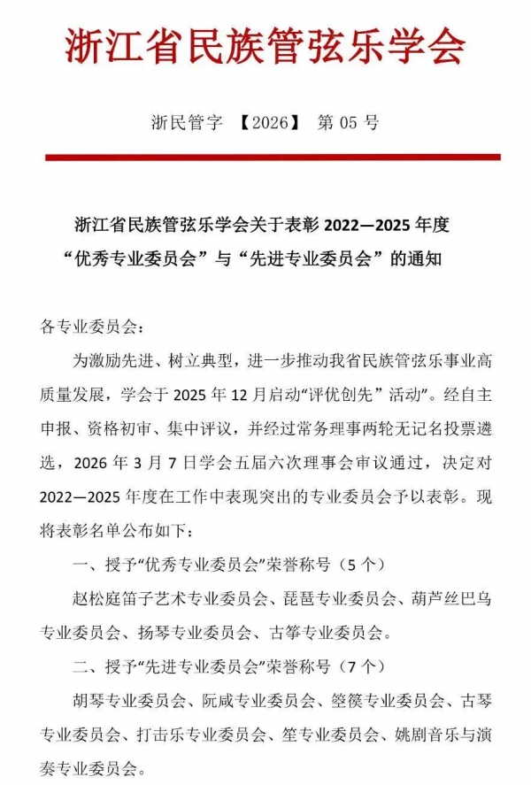 近日,浙江省民族管弦乐学会五届六次理事会圆满落幕。会议期间,经全体常务理事两轮无记名投票,赵松庭笛子艺术专业委员会凭借扎实的工作成效与突出的行业贡献,荣幸获评“优秀专业委员会”。