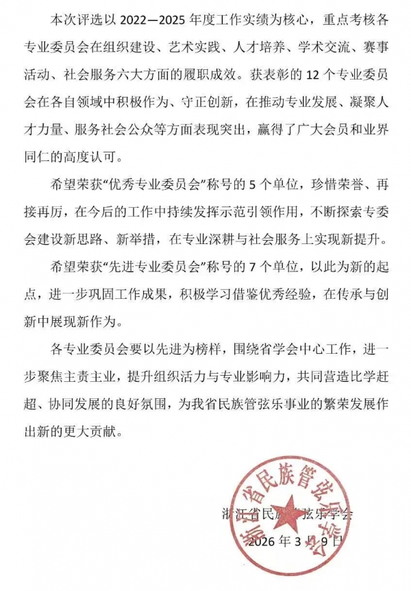 在浙江省民族管弦乐学会的正确指导与大力支持下,在学会各位老师的积极协助与密切配合下,我会全体成员团结协作、砥砺深耕、稳步推进各项工作,取得了阶段性成效。今后,我会将以此次获评“优秀专业委员会”为契机,持续深化“以赛促学、以赛促教”的工作宗旨,深耕笛子艺术的传承与创新,不断加强国内外行业交流与合作,全力推动浙江乃至全国笛子艺术事业高质量发展,为建设文化浙江、传承中华优秀传统文化贡献应有力量。