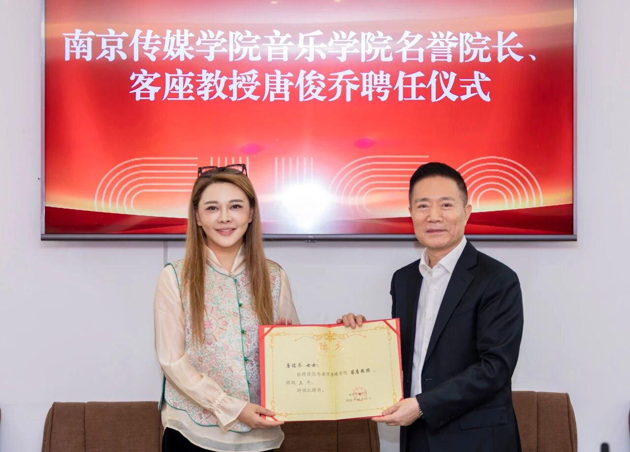 4月16日,南京传媒学院举行隆重聘任仪式,著名竹笛演奏家、教育家,上海音乐学院教授、博士生导师唐俊乔正式受聘为我校音乐学院名誉院长、客座教授。南京传媒学院创始人、董事长蒲树林,校长王更新,副校长王宇甜、唐玉斌,音乐学院领导班子及教师代表及相关部门负责人共同出席本次活动,会议由副校长唐玉斌主持。