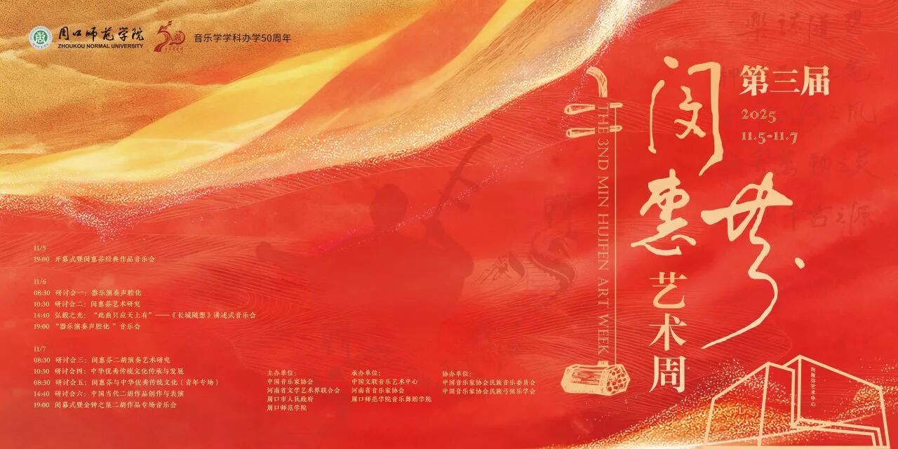 为深入学习贯彻习近平文化思想和党的二十届四中全会精神,弘扬中华优秀传统文化,在著名二胡演奏家闵惠芬先生诞辰80周年之际,由中国音乐家协会、河南省文学艺术界联合会、周口市人民政府、周口师范学院共同主办的第三届“闵惠芬艺术周”将于2025年11月5日至7日在周口师范学院举行。