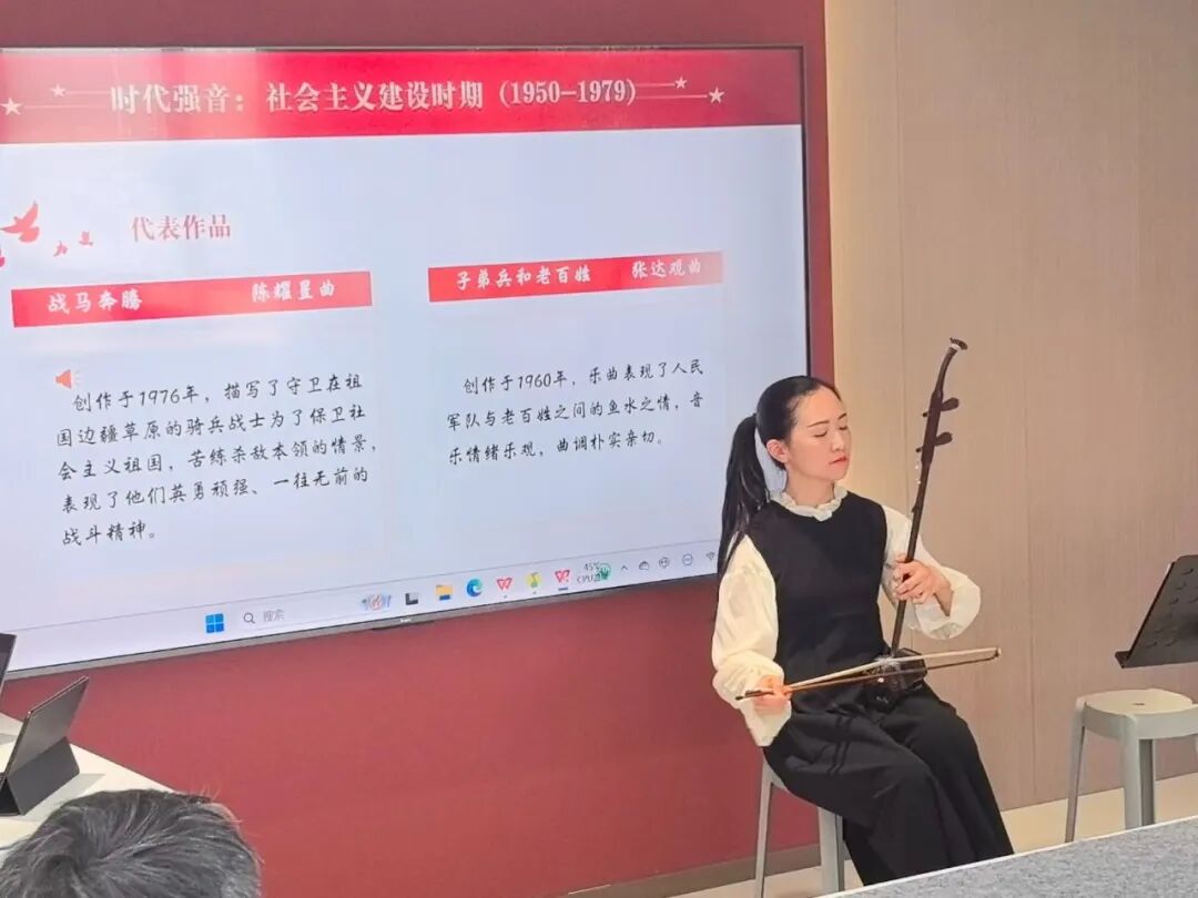 党课以“一把弓弦里的中国精神”为主线,王琳副教授从“血脉传承”——二胡与红色音乐的历史渊源讲起,分为四个时期进行详细梳理。并带领学生现场先后演奏了《听松》《洪湖人民的心愿》《红梅随想》《雪山魂塑》等经典二胡作品,并结合曲目背后的红色故事,生动讲述中国共产党人百折不挠的奋斗历程。讲演中,她还将二胡与党史关键节点“沉浸式”融合——从“九一八”事变后刘天华创作《光明行》唤起民族觉醒,到新中国成立以来器乐艺术服务人民的实践,再到新时代民乐人的使命担当,让居民在悠扬琴声中触摸历史温度,感悟信仰力量。
