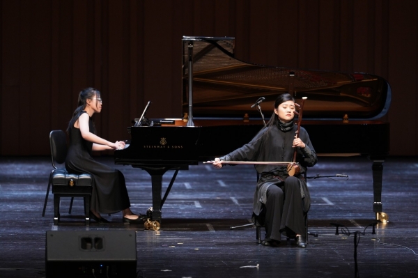 下半场以弦乐四重奏与板胡《幽默曲》(作曲:刘久暄)开场,陆续呈现《浮生若梦》(作曲:笪思甜)、《尘萤》(作曲:李可一)、《窗花绘梦》(作曲:罗成)、《灼》(作曲:姚苏栩)和《一抹红妆》(作曲:赵夺良、赵紫茵)等作品。其中,《窗花绘梦》融陕西民间音乐与窗花剪纸意象,地域风格鲜明;《灼》以火焰为意象,结合秦腔元素,象征板胡艺术薪火相传;压轴曲《一抹红妆》改编自东北民歌《月牙五更》,融入流行、爵士元素,由赵夺良教授与女儿赵紫茵同台演奏,成为“守正创新”的生动写照。