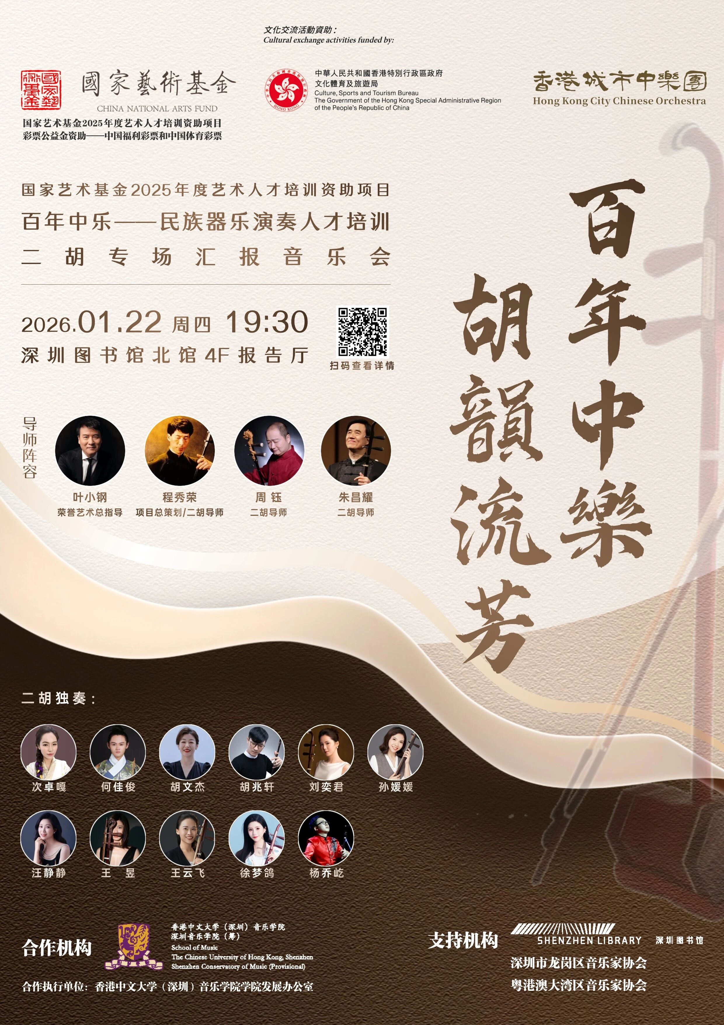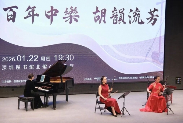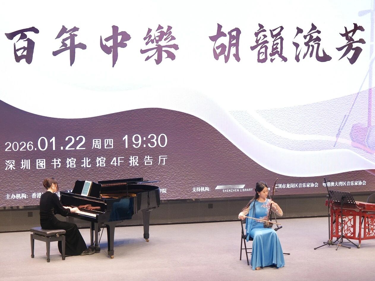 2026年1月22日晚上,由香港城市中乐团主办、香港特区政府大力支持的国家艺术基金2025年度资助项目“百年中乐——民族器乐演奏人才培训”二胡专场汇报音乐会,在深圳图书馆北馆报告厅隆重上演!