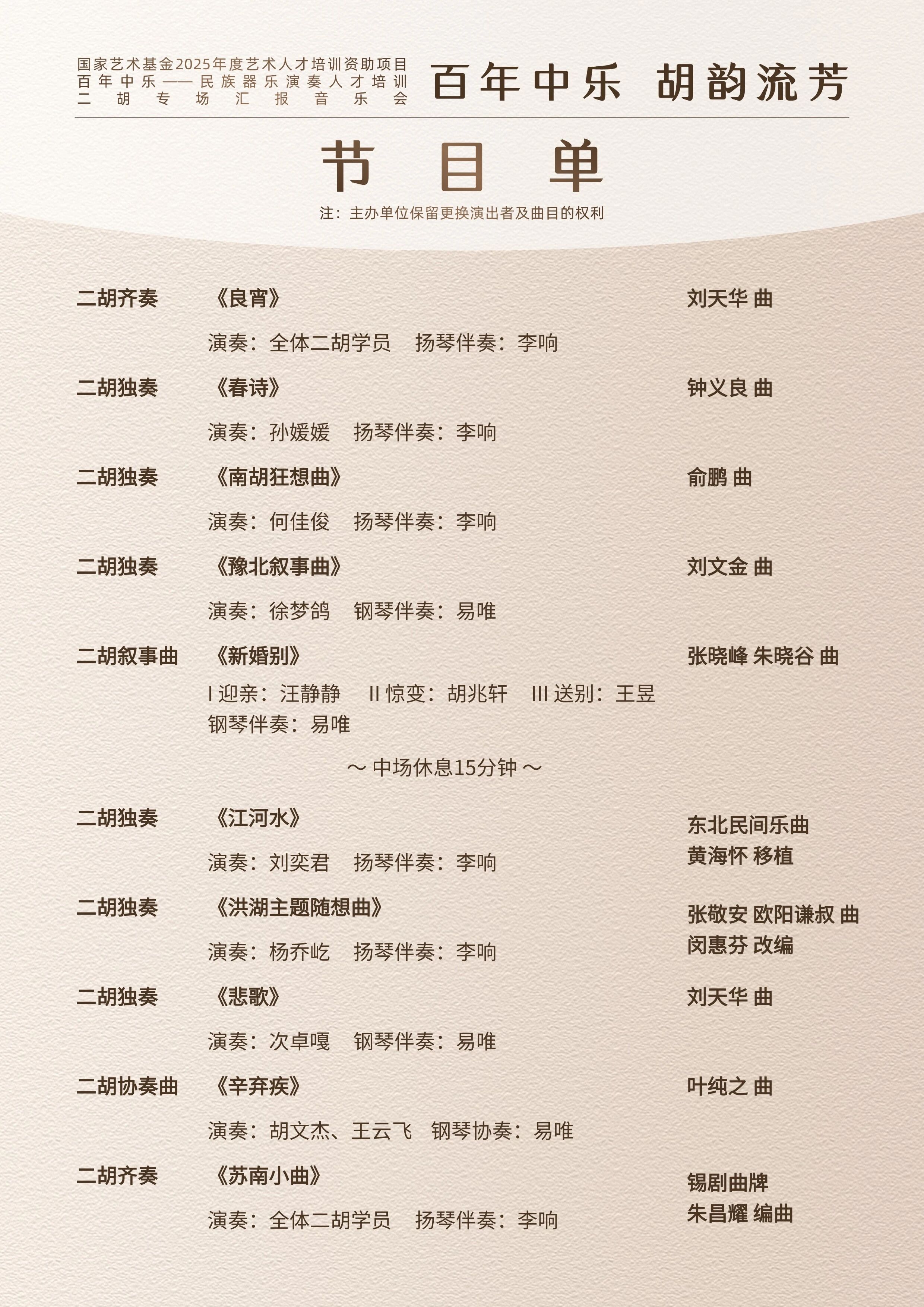 本次二胡专场音乐会由著名胡琴演奏家程秀荣、周钰、朱昌耀悉心教学和指导,传授经典曲目及其文化内涵。