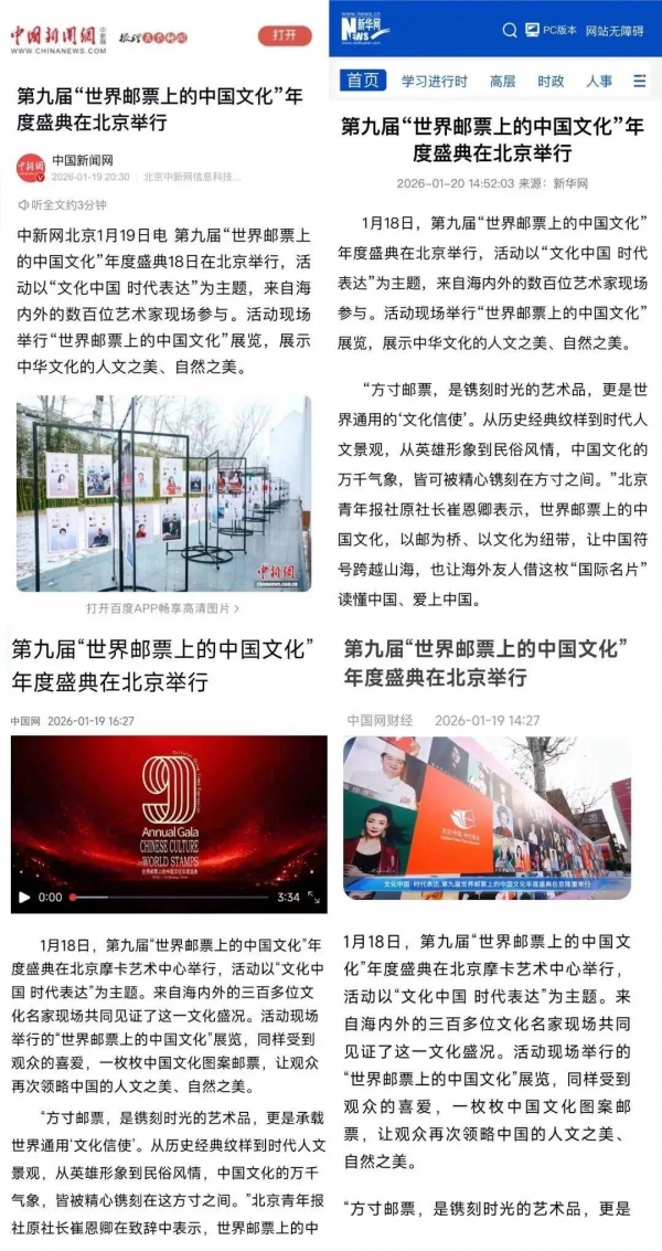 2026年1月18日,第九届“世界邮票上的中国文化”年度盛典在北京摩卡艺术中心举行。这场以“文化中国 时代表达”为主题的盛会,吸引了海内外三百多位优秀艺术家出席。