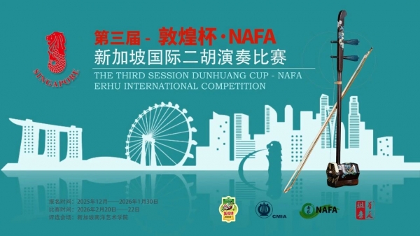 2026年2月21日,第三届“敦煌杯·NAFA”二胡演奏比赛新加坡国际赛区,在新加坡艺术大学南洋艺术学院李氏基金剧场成功举办。来自新加坡、中国、美国和中国台湾等地区的选手齐聚一堂,同台竞技、共展琴艺。