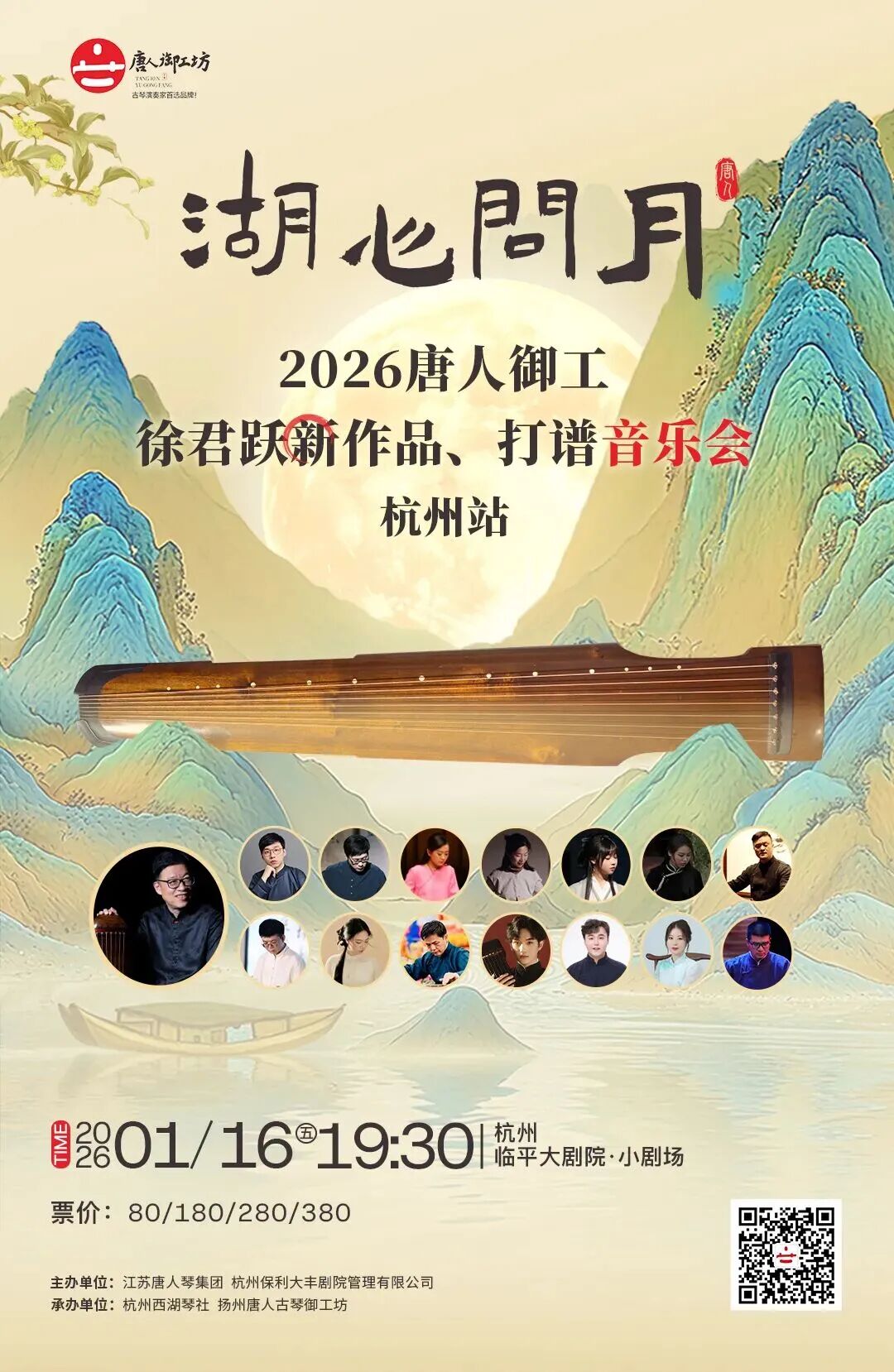 浙韵流芳,琴约杭城。 七弦泠泠,自古便是千年知音相和的桥梁。岁寒时节,西子湖畔,“西湖元音”琴乐团将携“唐人御工”名琴【湖心问月】,与徐君跃先生凝萃心血的新作古谱,踏歌而来。2026年1月16日,诚邀您共赴一场古韵今声的雅集,在千年琴音的流转间,聆听徐君跃先生指尖下的新声,共谱一曲属于这个冬日的山水清音。
