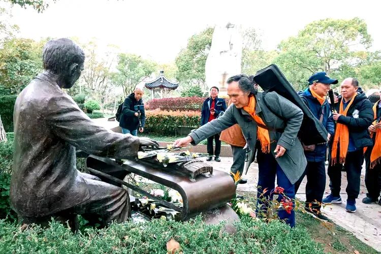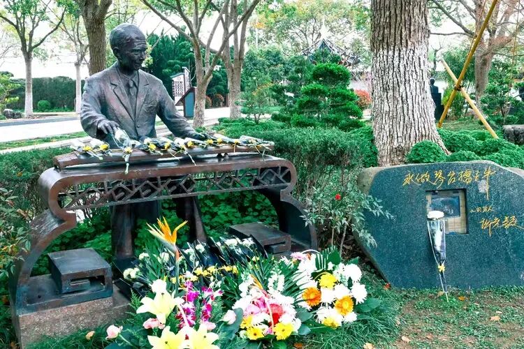 室内纪念环节结束后,嘉宾们移步至滨海古园名人之林,在许光毅先生弹古琴雕像前依次敬献鲜花。据悉,许光毅先生于2000年逝世后长眠于此,雕像定格了他专注抚琴的瞬间,静静守望着他毕生挚爱的民族音乐事业。