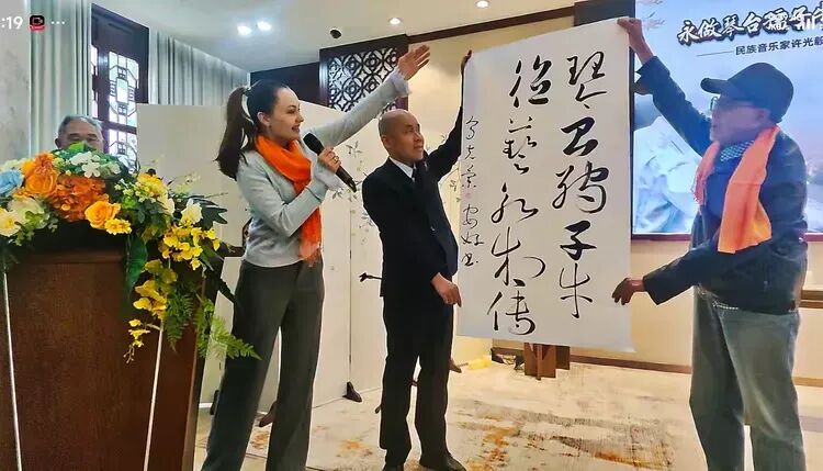 国粹胡琴艺术收藏馆副馆长陈迪栋与乌克兰友人安娜还分别向本次纪念活动赠送书法作品。