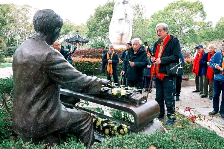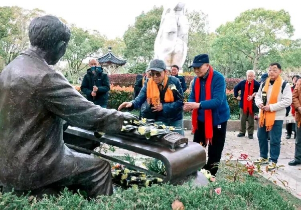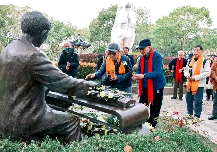 室内纪念环节结束后,许国屏先生带动嘉宾们移步至滨海古园名人之林,在许光毅先生弹古琴雕像前依次敬献鲜花并合影留念。