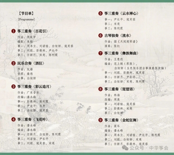 《飞花叶》同样由潘永峰作曲编曲。筝音时而如飞花般轻盈飘落,时而又如叶片般沙沙作响。演奏老师们巧妙地运用滑音、颤音等技巧,将乐曲中的情感表达得细腻入微,仿佛带领观众走进了一个充满诗意的自然世界,感受着花开花落、叶生叶落的美好。