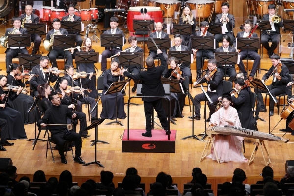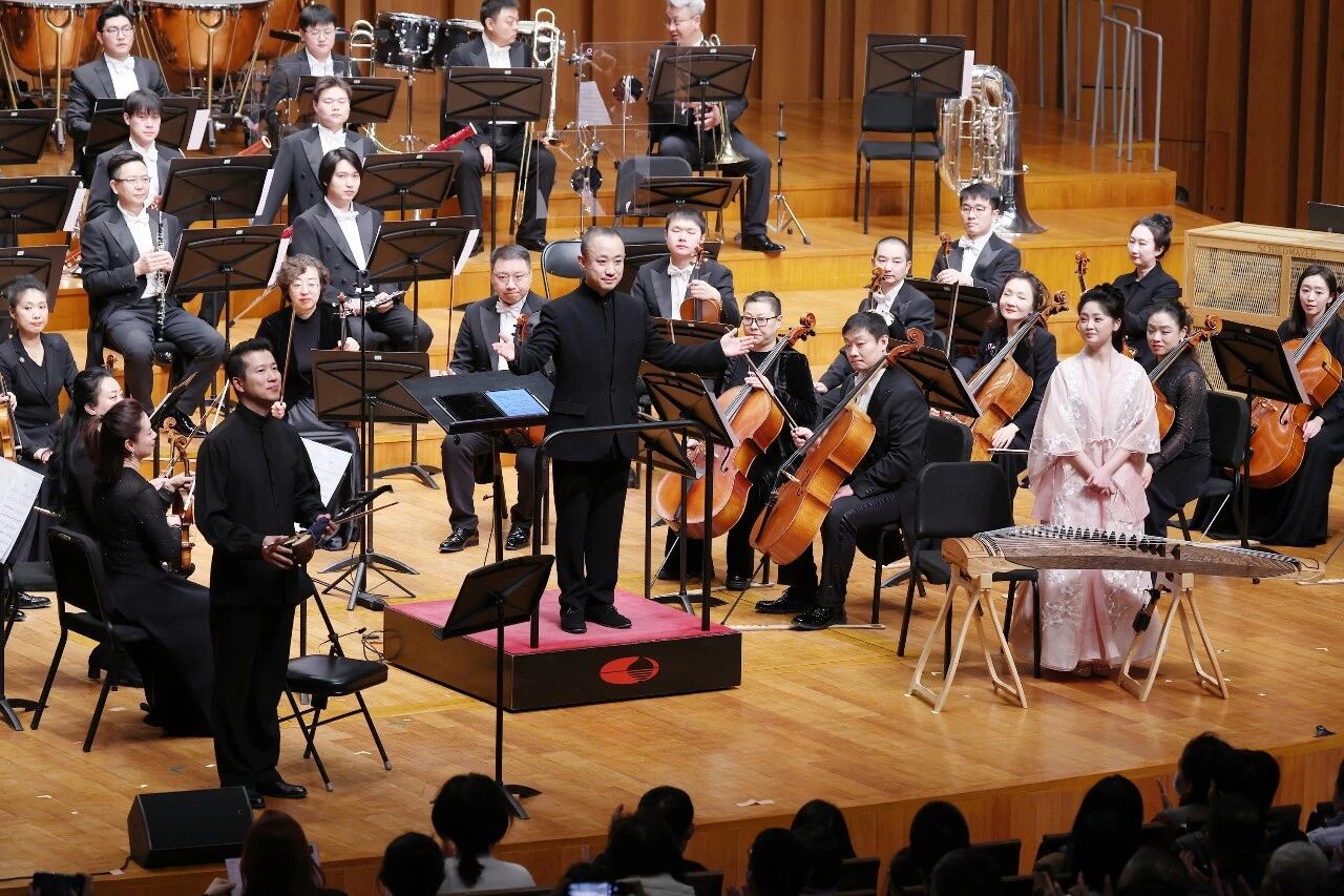 身着飘逸礼服的王钰,在观众们热烈的掌声中稳步登台。她以创作与演奏的双重身份,以丝弦为媒,为观众细腻地诠释了“归雁传情、丝弦和鸣”的深层意蕴。她对《归雁书》这首作品的演绎打破了独奏时的 “气场主导”,指尖力度收放自如,与板胡时而高亢,时而吟唱的起伏旋律丝弦和鸣。胡瑜教授在演奏中以细腻音色呼应,开篇处用近似陕北民歌的旋律起 “问”,如归雁长鸣;王钰的古筝随即以连绵滑音作 “答”,似家书絮语。中段旋律交织时,板胡的刚劲被古筝的柔润包裹,古筝的婉转因板胡的豪迈更显层次,恰如归雁掠山川的 “一呼一应”。王钰将创作理解融入演奏,肢体语言舒展不张扬,赋予了古筝深沉内敛又不失艺术张力的气质与气魄。音乐结构层层递进、跌宕起伏,行至尾声处,板胡、古筝与交响乐队的旋律交织碰撞,瞬间将乐曲推向辽阔释然的强音高潮,全场随即爆发出热烈的掌声。