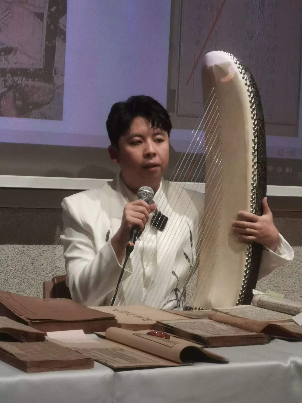 弦乐沁人心,典籍映白塔,青年箜篌演奏家李子旭老师, 用当代箜篌以及复原唐代箜篌, 诠释了《春江花月夜》等中国弦乐作品, 并展示了唐代箜篌的音色, 典籍收藏家/投资人汪之雄分享了其收藏的,描述箜篌的中国古代典籍。