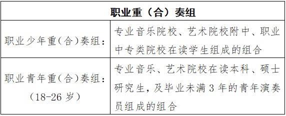 职业组:面向专业音乐院校、艺术院校附中、音乐学院等艺术类专业在读学生及毕业生,不得兼报非职业组。