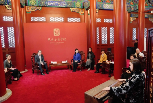会谈在民乐系赵晓霞教授用唐代古琴“太古遗音”演奏的名曲《流水》中拉开序幕。于红梅院长介绍了《流水》所蕴含的“高山流水遇知音”的美好寓意,通过此曲迎接费城交响乐团一行,表达了对双方共续友谊、深化合作的祝福与期待。睿恩德总裁回顾了十年前双方进行的首次合作,时任费城交响乐团音乐总监、著名指挥家雅尼克·尼杰-赛冈来校访问并举办大师班,学生的专业能力和求学热情给他留下了深刻印象。十年弹指一挥间,很荣幸如今能与中央音乐学院深化伙伴关系,希望彼此的合作能够长期延续。
