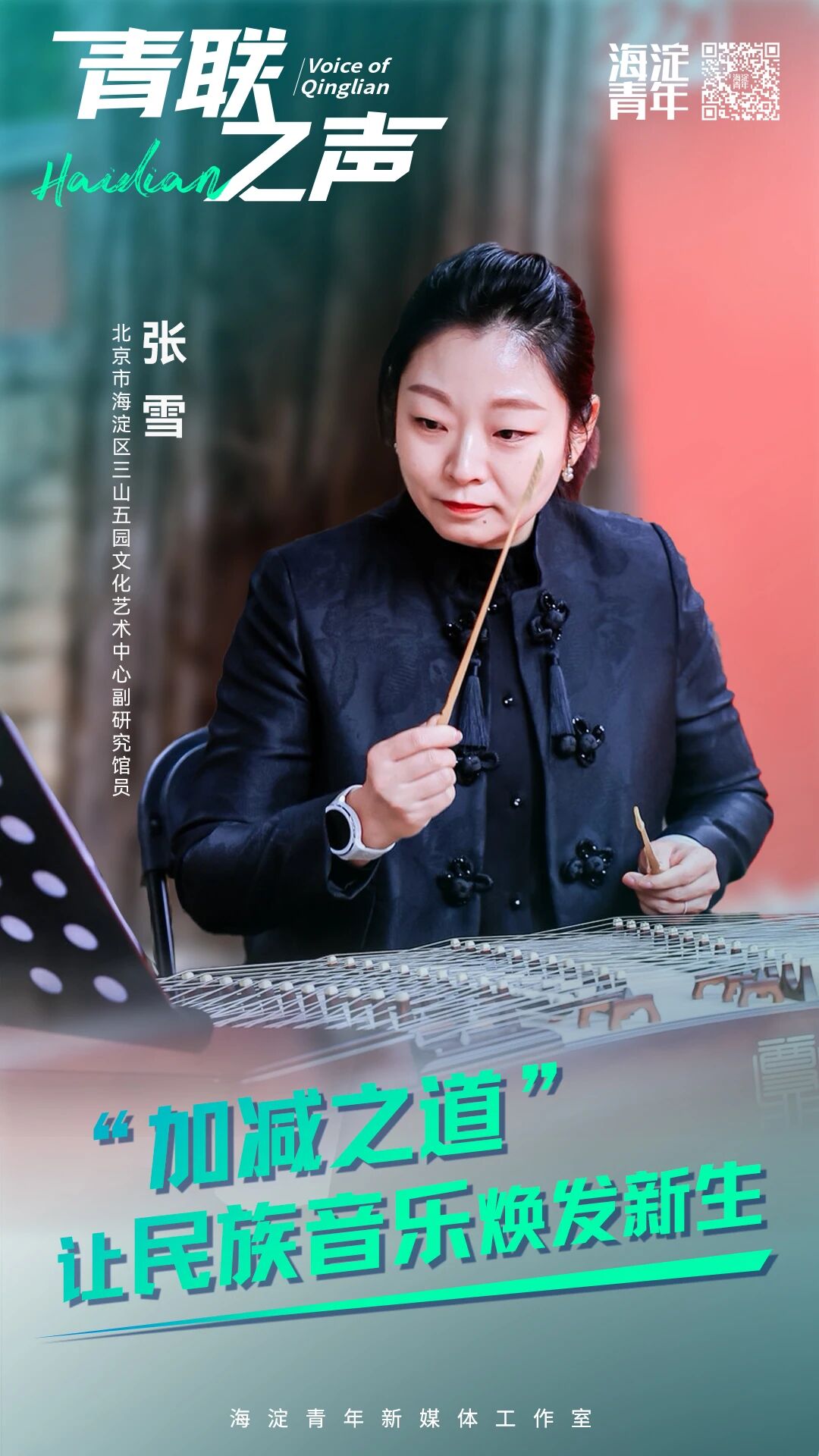 从中央音乐学院的扬琴专业学子,到海淀区三山五园文化艺术中心的副研究馆员,海淀青联委员张雪在海淀群众文化领域深耕了二十年。没有轰轰烈烈的宣言,她带着专业所学一头扎进基层,用“接地气”的方式做艺术普及,把民族音乐从课堂搬到田间地头、社区广场,再通过国潮、数字化等年轻人喜欢的形式推陈出新,慢慢走出了一条民族音乐普及的“海淀路径”。