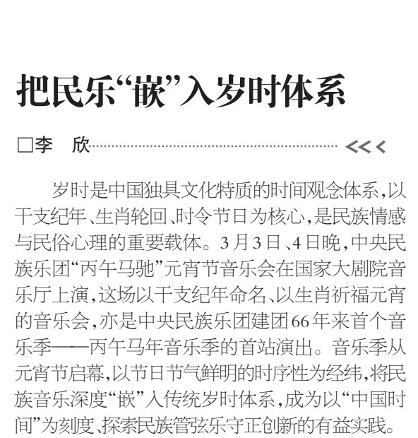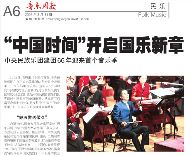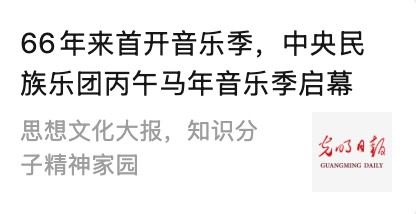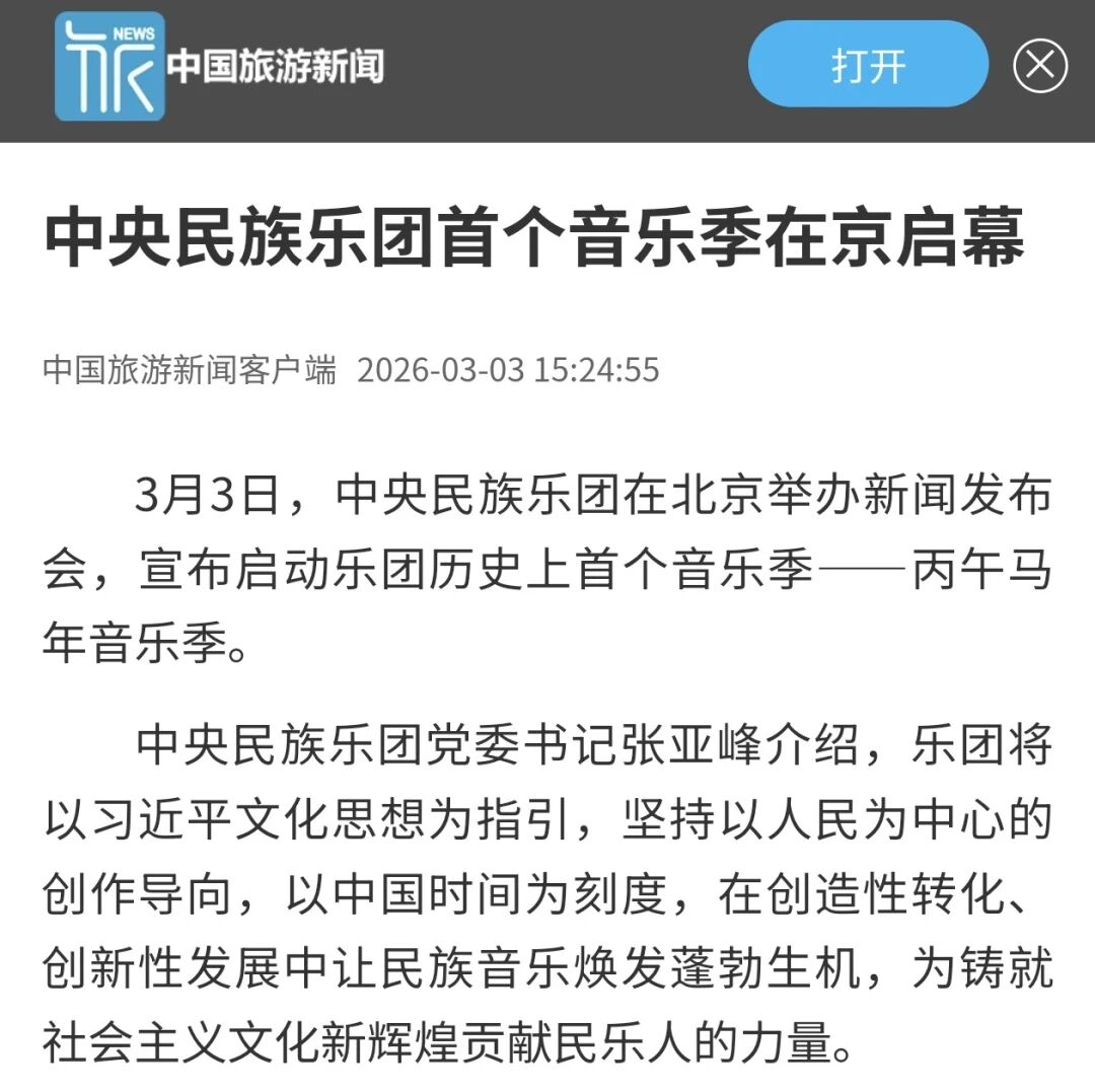 3月3日正值农历正月十五元宵佳节,中央民族乐团在北京举办新闻发布会,正式宣布启动乐团历史上第一个音乐季——丙午马年音乐季。当晚,“丙午马驰”中央民族乐团元宵暨丙午马年音乐季开幕音乐会在国家大剧院精彩上演。这是中央民族乐团成立66年首次启动音乐季。在66年的时光沉淀中,一大批具有民族特色的民族管弦乐作品经过整理挖掘、反复打磨,以全新的姿态走进大众视野,用民族的音乐语言讲述中国的时代故事。此次活动获得人民日报、光明日报、中央广播电视总台、新华社、中新社、中国文化报、音乐周报、中国日报、中国青年报、环球时报、中国艺术报、北京卫视、北京日报、北京青年报等诸多媒体的集中关注报道。