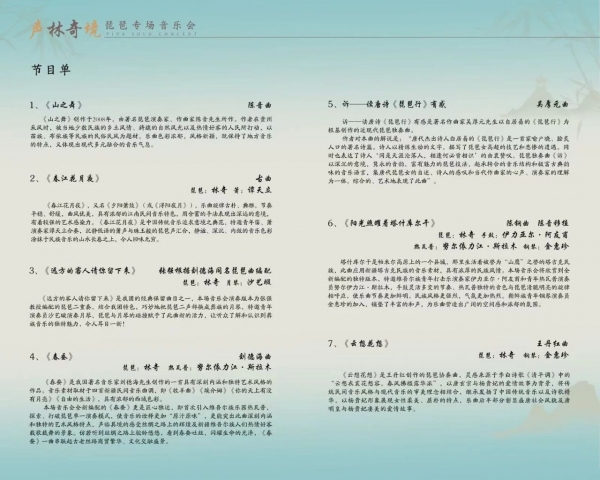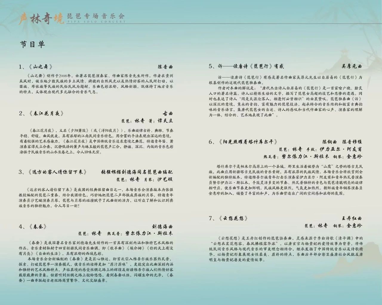 全新编配的《春蚕》以热瓦普与琵琶对话,再现丝绸之路上商旅络绎、文化交融的盛景,经典曲目《远方的客人请你留下来》创新改编为琵琶与彝族月琴的二重奏,赋予传统旋律崭新的活力,《春江花月夜》静谧悠远,《云想花想》浪漫恢弘。十余首曲子既有西域丝路的驼铃回响,又有云贵山林的舞步欢腾......演奏员们将以多元器乐对话,诠释中华民族“和而不同”的共生之美。