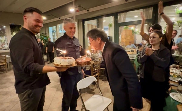 这场承载着河北文化交流使命的音乐会圆满落幕后,一份意外的温暖悄然降临——当日恰逢我71岁生辰。伙伴们早已备好了生日蛋糕与葡萄美酒,烛火摇曳间,满满的祝福将连日筹备的疲惫轻轻拂去;次日,希腊华人华侨总会的朋友们更是特地设宴相迎,餐桌上,冒着热气象征福寿的长寿面,烛光闪烁的生日蛋糕,美味可口的浙江美食,顿时沉浸在侨胞们浓浓的乡情和友情之中!为表谢意,我和乐友们当即拿起琵琶、二胡和小提琴,为侨胞们献上了《梁山伯与祝英台》和《采茶扑蝶》等乐曲,熟悉的乡音,令在座浙江、福建的侨胞眼中泛起的微光,让异乡的情谊愈发醇厚。