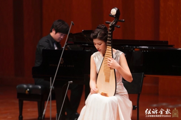 七首曲目中包含三首琵琶独奏作品:《昭君出塞》《秦俑》《月儿高》,三首琵琶和钢琴作品:《侬》《晚秋》《寻·耶婆瑟鸡》,以及一首琵琶重奏作品:《梦入江南》。值得一提的是,本场音乐会的演奏者年龄横跨附中三年级至研究生三年级,这一年龄跨度恰好展现了上音琵琶教学体系的完整脉络。少年学子的扎实功底与高年级学生的艺术深度在舞台上交相辉映,呈现出人才培养的阶段性成果。