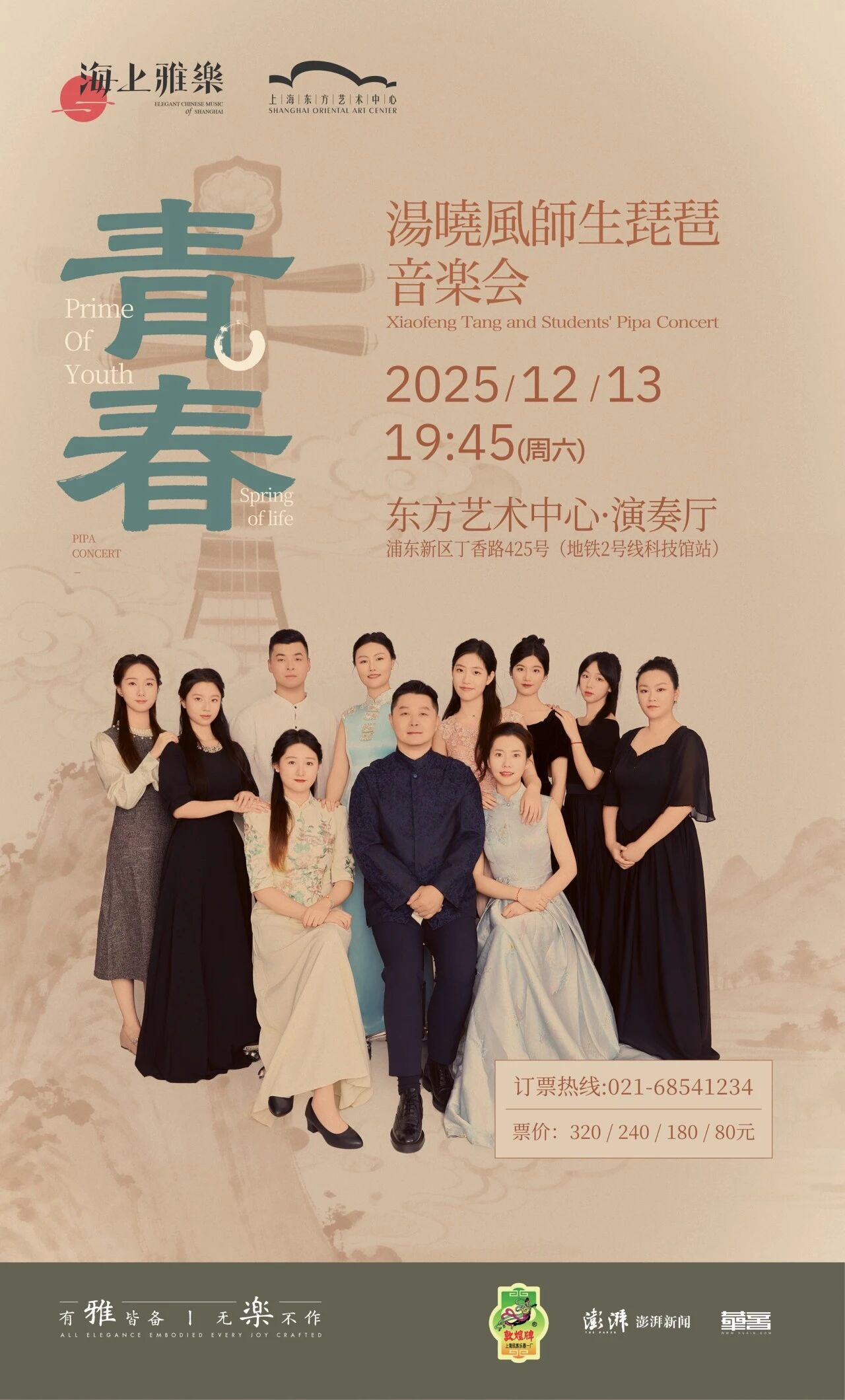 以青春之名,更要彰显学术与艺术的担当。汤晓风老师,将携十位弟子重磅呈现平湖派大套武曲《淮阴平楚》十八段全版。这部集琵琶技艺之大成的名篇,在汤晓风的率领下,不仅是技艺传承的庄严宣告,更是新时代青春气象的豪迈表达。以青春之名,行走在守正与创新的道路上。本场演奏的现代作品皆为近年首演,风格多样、曲风高雅,传统与现代在此交织。中国琵琶的青春意象,在汤晓风老师与彭璐莹、王哲慧、王冠杰等青年琵琶演奏家们的指尖绽放,以拼搏与刻苦弹奏出属于这个时代的青春音响。