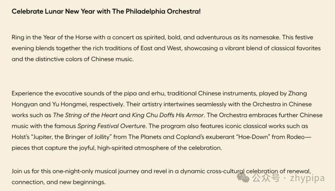 如今,回望这场跨越国界的音乐之约,依旧令人心潮澎湃。而这份音乐情谊并未落幕,2026 年 1 月 28 日,中央音乐学院院长于红梅教授、民乐系主任章红艳教授将再度携手费城交响乐团,带来 2026 农历马年新年音乐会;1 月 29 日,刘沙指挥将率领中央音乐学院民族管弦乐团登陆费城金梅尔表演艺术中心,献上一场中国民族音乐盛宴。