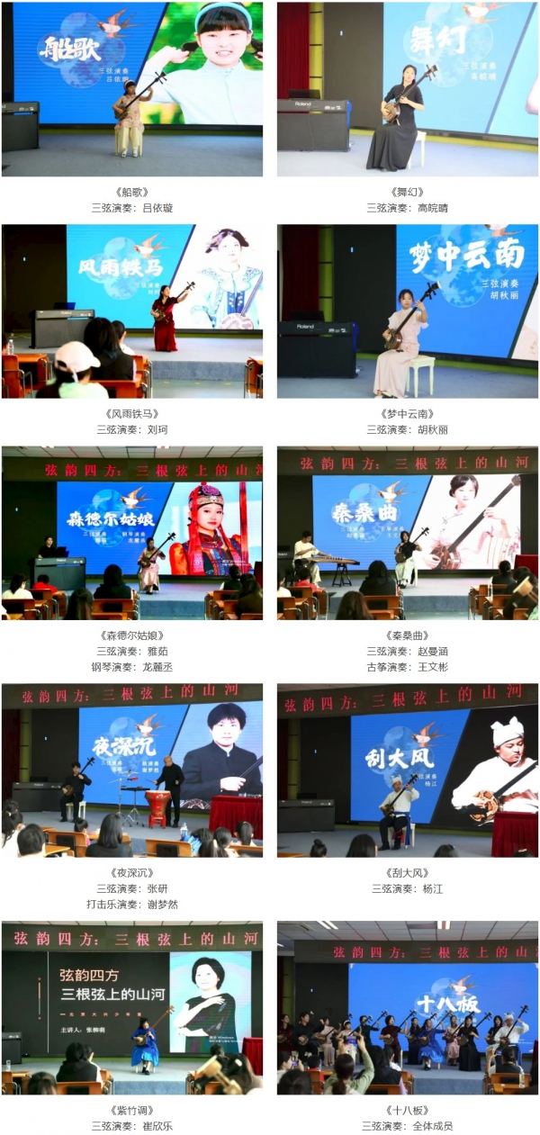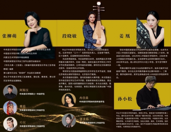 本场⾳乐会曲⽬跨越传统和现代,既有《⻛⾬铁⻢》这样描绘意象的传统曲⽬,也有融合蒙古族⾳乐元素的《乌纳钦》和加⼊⻄域⾳乐⻛格的《沙漠之旅》等,多种⻛格的三弦经典曲⽬轮番上演。通过独奏、协奏、⻬奏等多种形式,系统展示三弦丰富的⾳乐语⾔和跨⽂化融合能⼒。