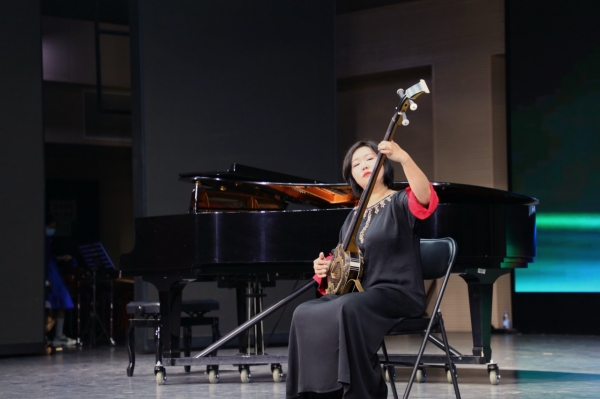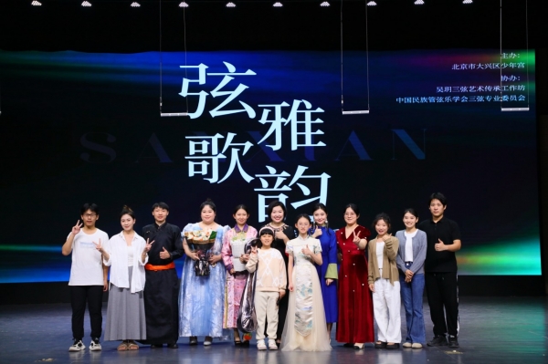 最后,⼤兴区少年宫吴玥三弦艺术传承⼯作坊的弦索筝鸣乐团⼩朋友们登上舞台,他们演绎的《⻄藏舞曲》别出⼼裁地融⼊了古筝、⼤提琴、低⾳提琴和⿎等乐器,碰撞创造出令⼈⽿⽬⼀新的听觉体验。
