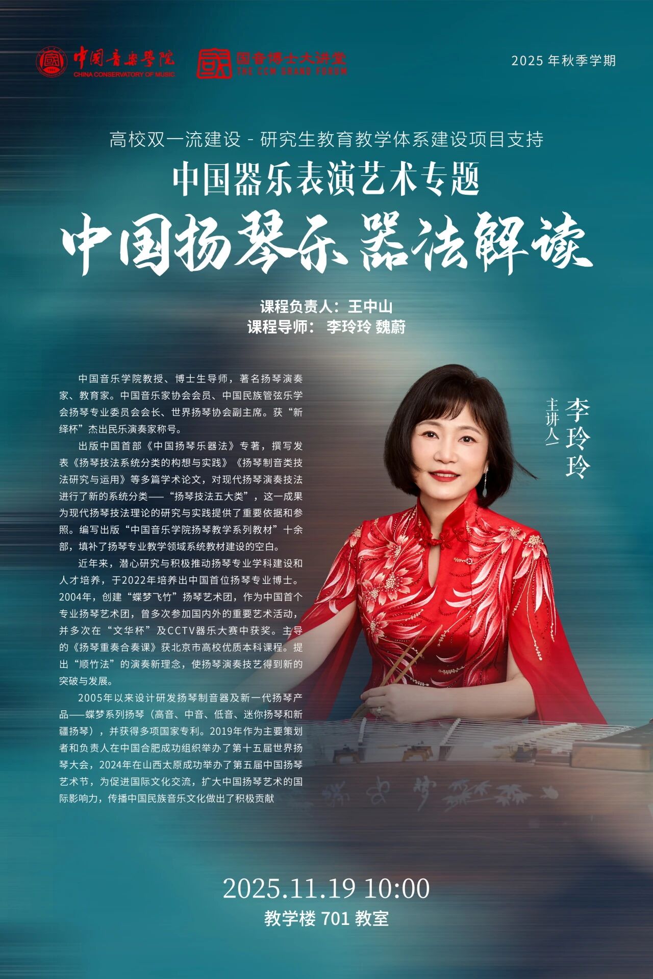 本次讲座围绕《中国扬琴乐器法》展开,核心聚焦扬琴的形制特点、核心演奏技法及独特音响特征。现场将通过实物直观展示与技法示范演奏相结合的方式,引导学生掌握扬琴乐器法核心要点,进一步加深对扬琴艺术的理解与认知。