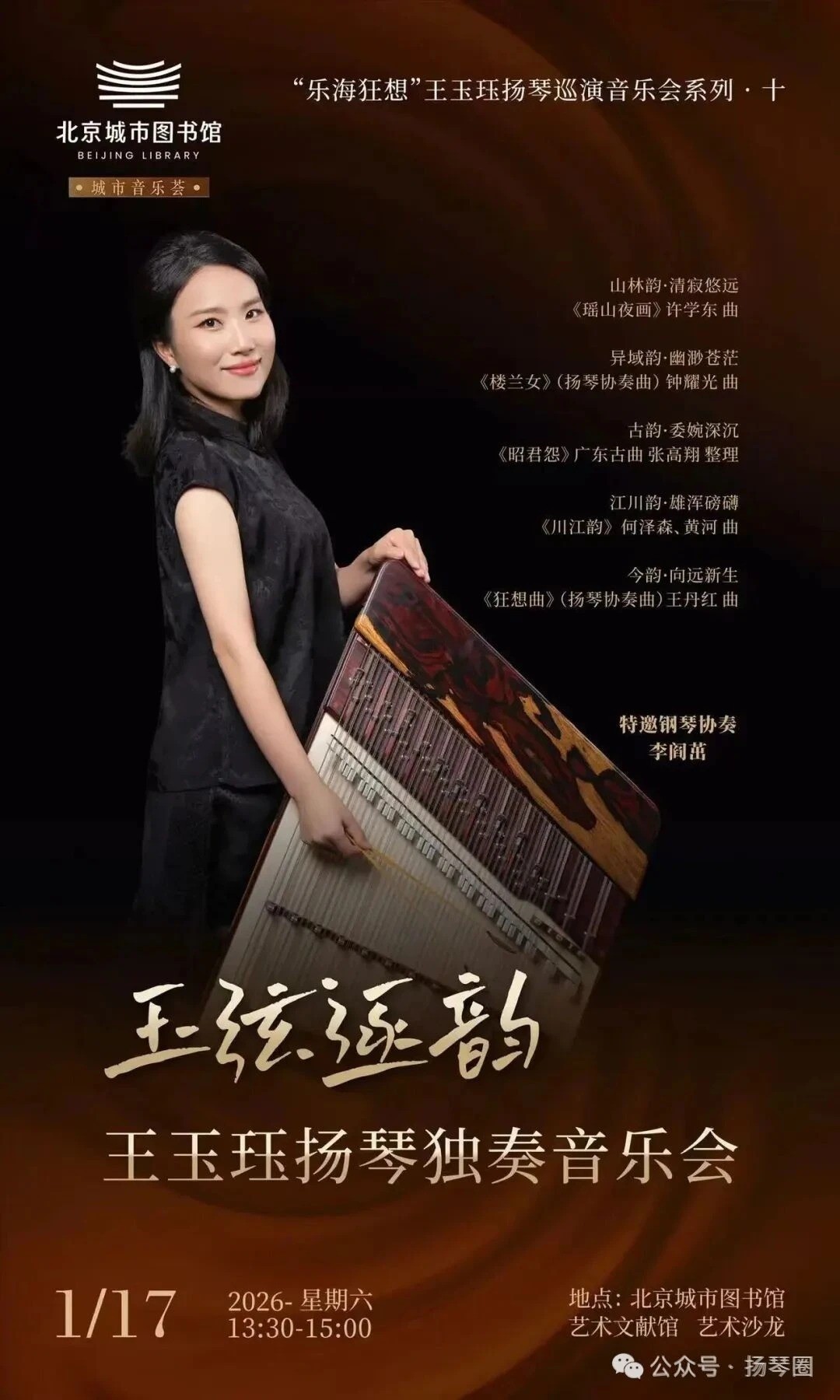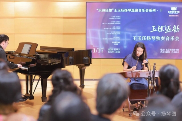 2026年1月17日,“乐海狂想”·王玉珏扬琴巡演系列音乐会·十——玉弦逐韵·王玉珏扬琴独奏音乐会在北京城市图书馆艺术文献馆圆满落幕。青年扬琴演奏家王玉珏演绎五首风格迥异的经典之作,音乐会以“初心-拓界-传承-扎根-未来”为序,特邀李阎茁担任钢琴协奏,为现场观众献上一场兼具东方雅韵与时代活力的民族音乐盛宴。出席此次音乐会的嘉宾有著名扬琴演奏家、教育家、中央音乐学院博士生导师黄河教授;中央民族大学博士生导师许学东教授;中央民族大学音乐学院博士生导师张朝教授;中国戏曲学院钱伟宏教授;中国戏曲学院李瑾副教授;中国音乐学院罗媛老师;华中科技大学艺术学院陈妍君老师。