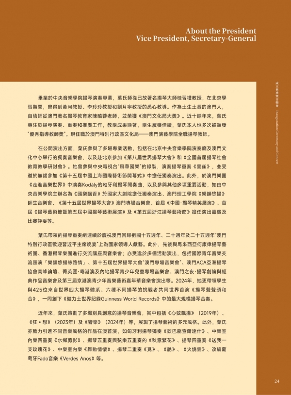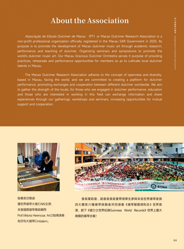 会长叶凯莹表示,扬琴作为跨越千年的世界性乐器,经海上丝绸之路传入澳门,而四百多年来,澳门作为中西文化交流窗口,澳门扬琴研究学会肩负三大使命: