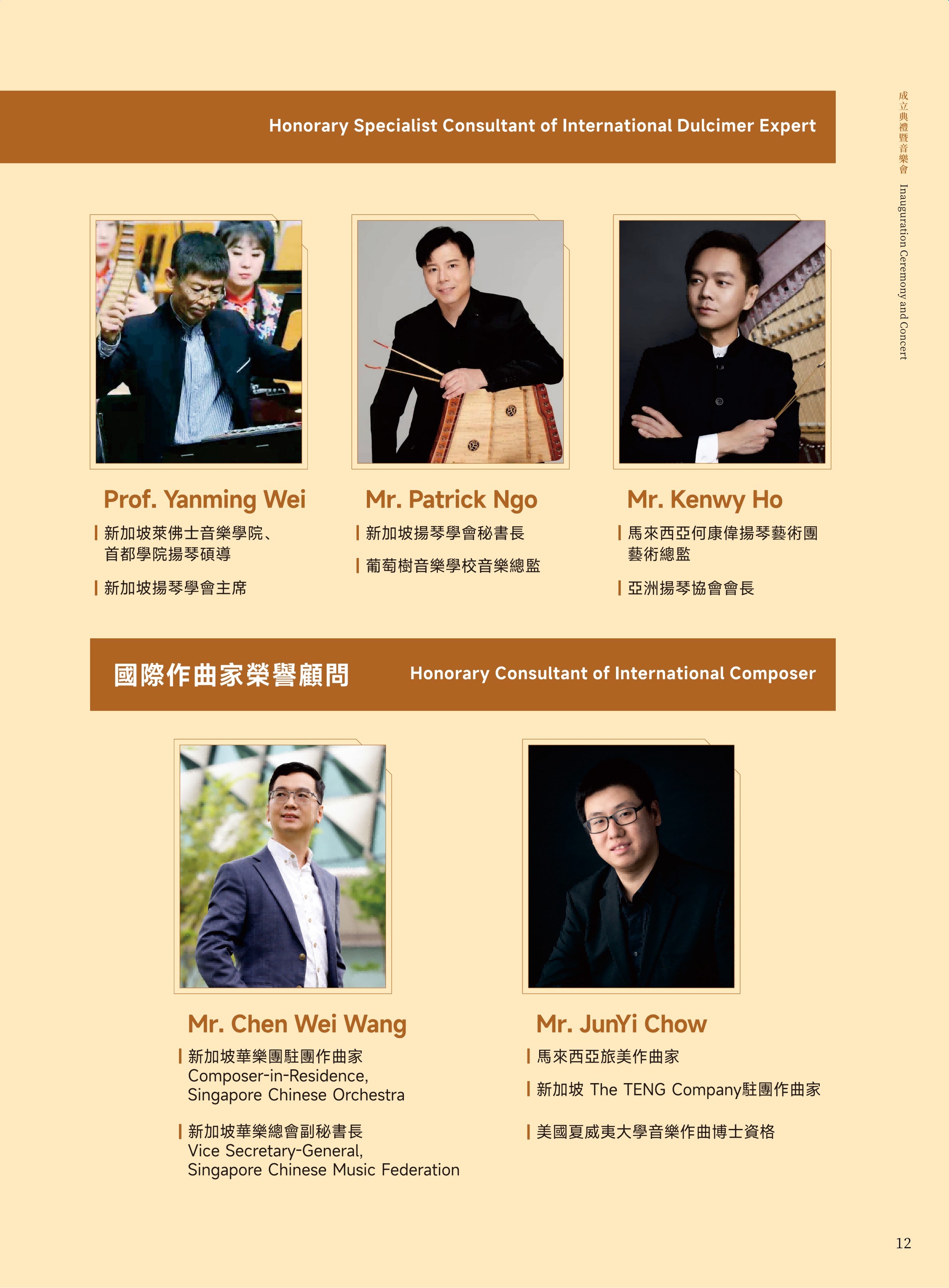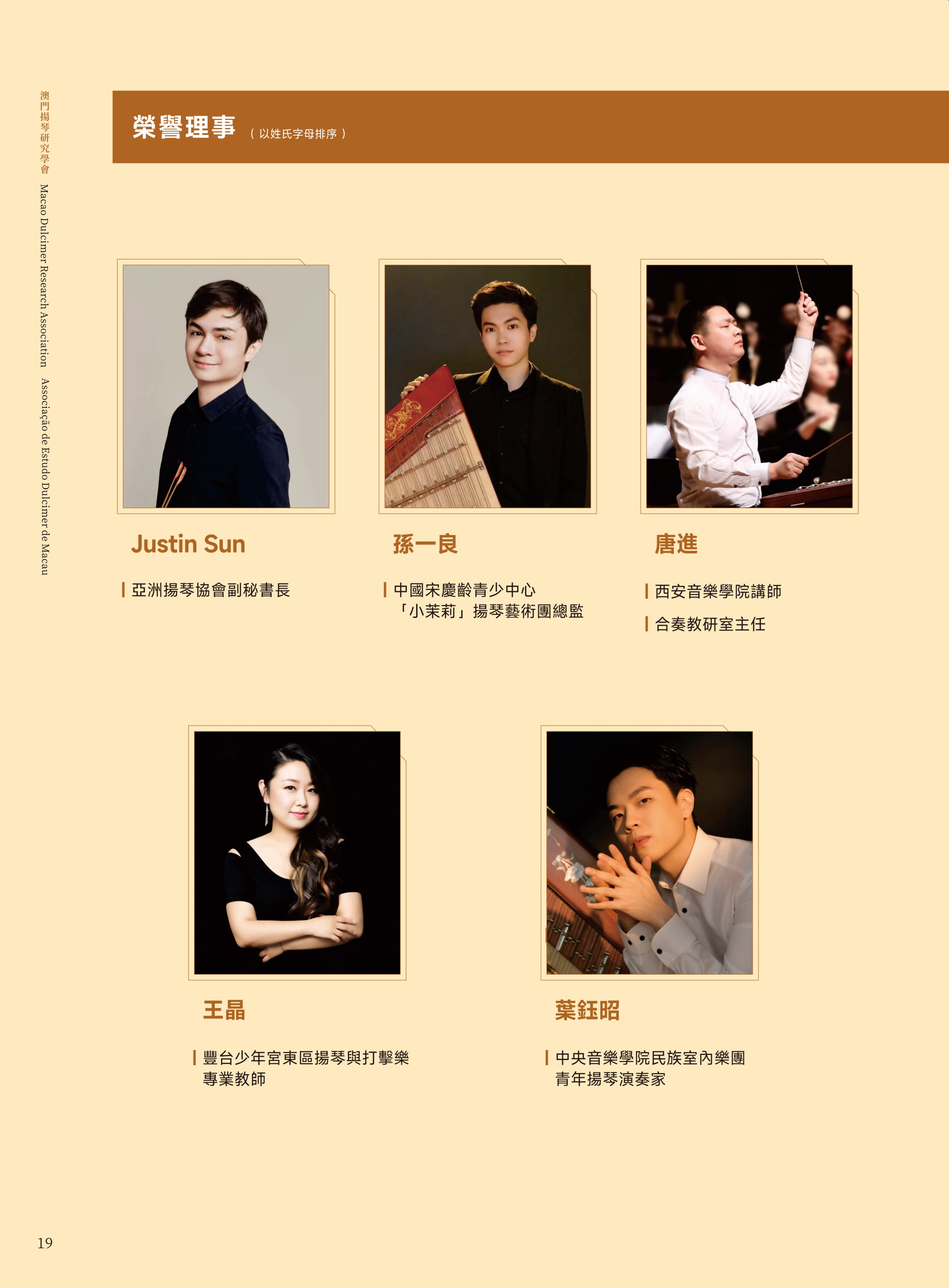 澳门文化局演艺活动处陈淑美处长;澳门文化界联合会副会长、澳门乐团有限公司董事、澳门青年交响乐团理事长许健华先生;澳门中乐团音乐总监兼首席指挥张列先生;中国音乐学院博士生导师、中国民族管弦乐学会扬琴专业委员会会长李玲玲教授;东方基金会驻澳门办事处柯天玲主任;澳门城市大学音乐学博士课程负责人戴定澄教授;香港扬琴总会创会及荣誉会长余美丽老师;中国乐器协会扬琴专业委员会副会长、澳门国际音乐艺术交流协会会长袁泉老师;澳门著名扬琴教育家、澳门扬琴研究学会永远荣誉会长陈晓蓉老师。
