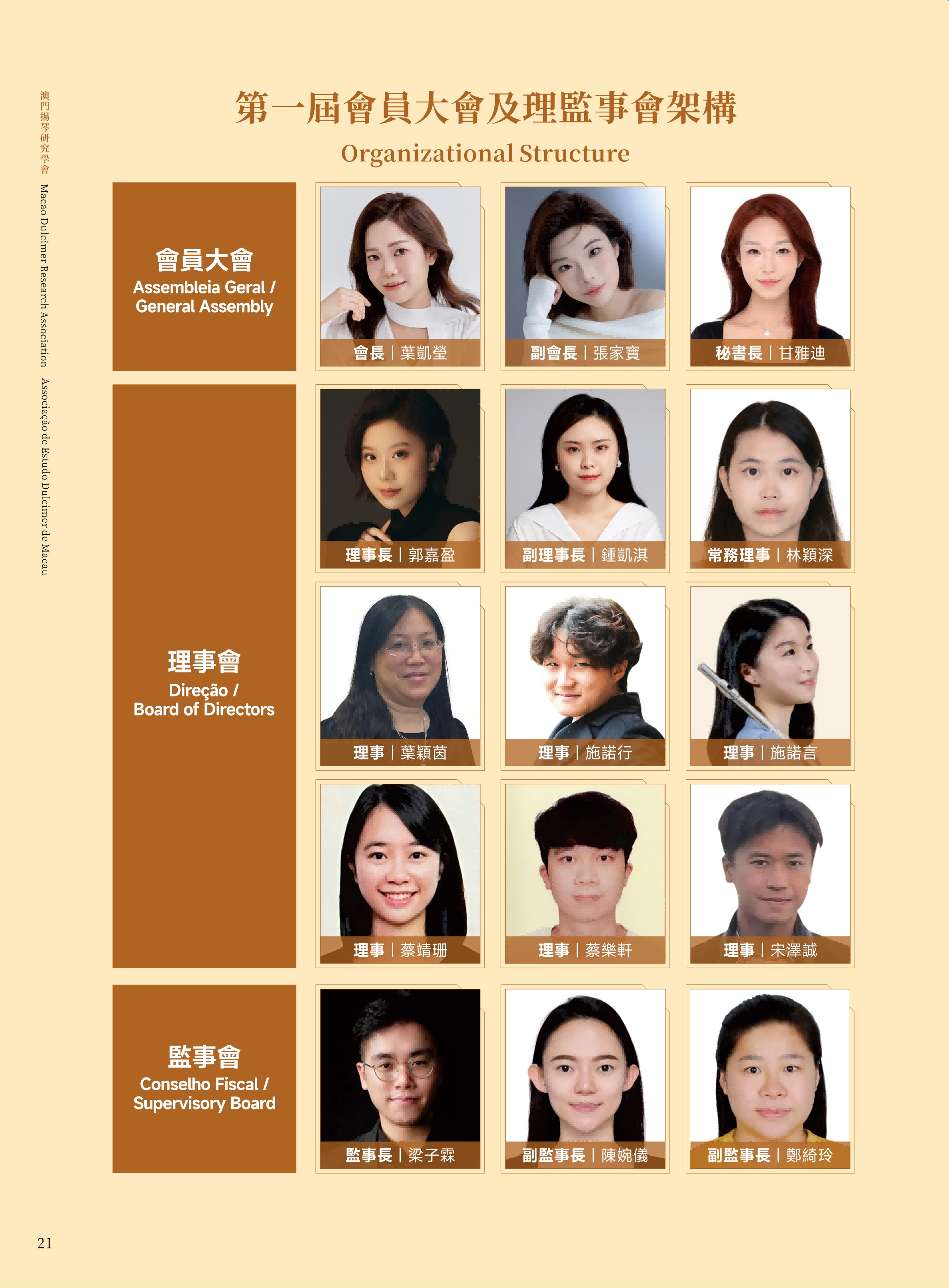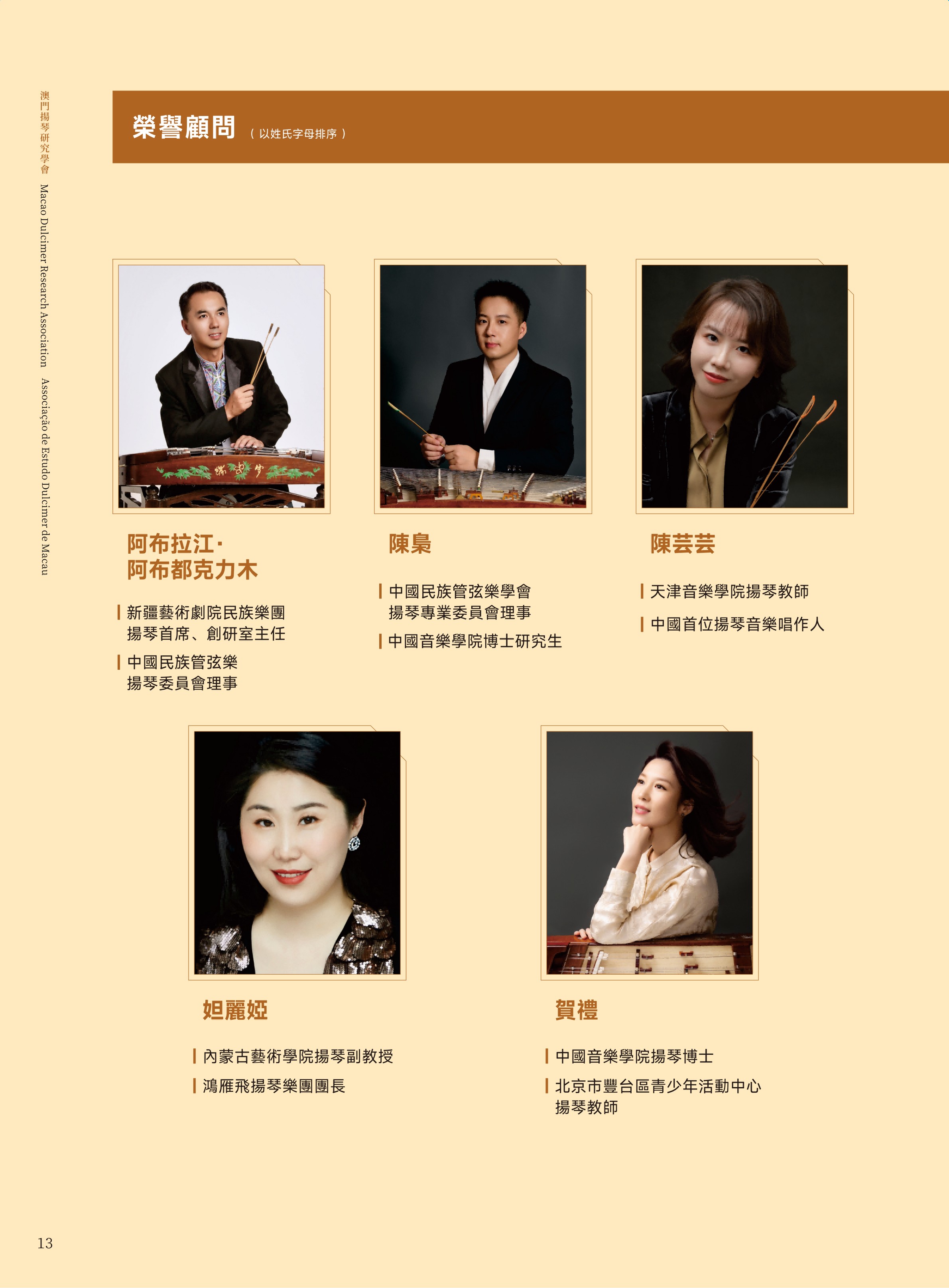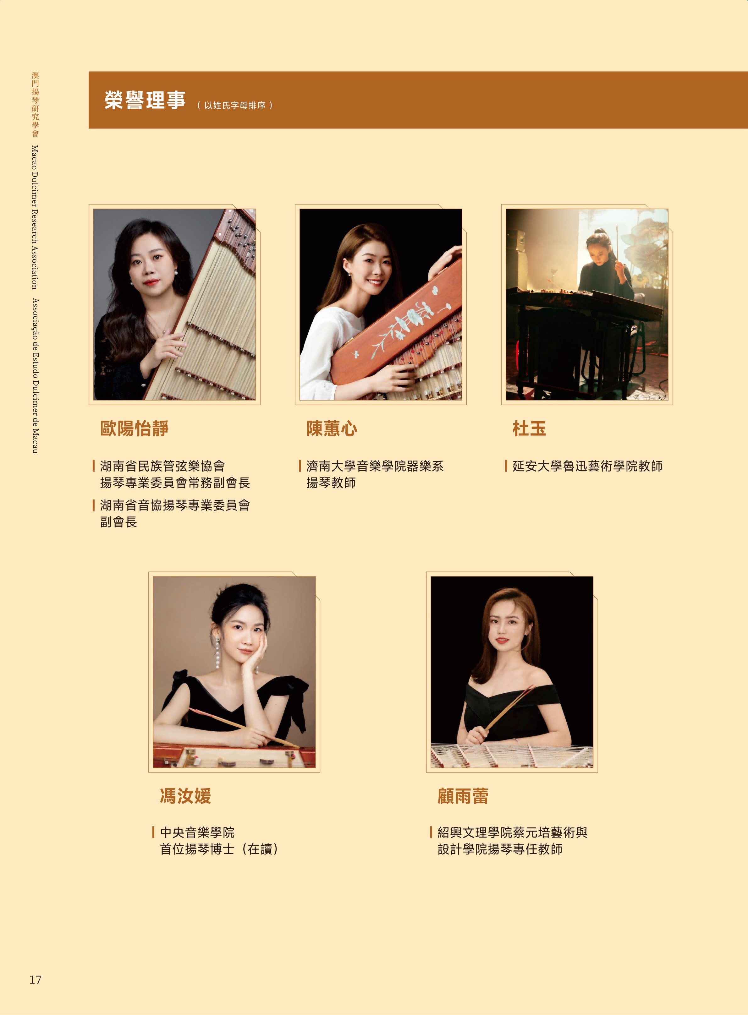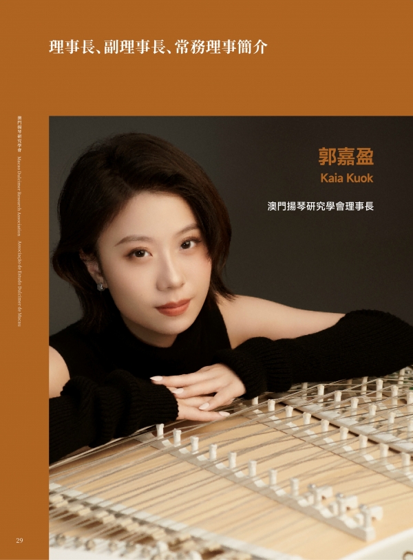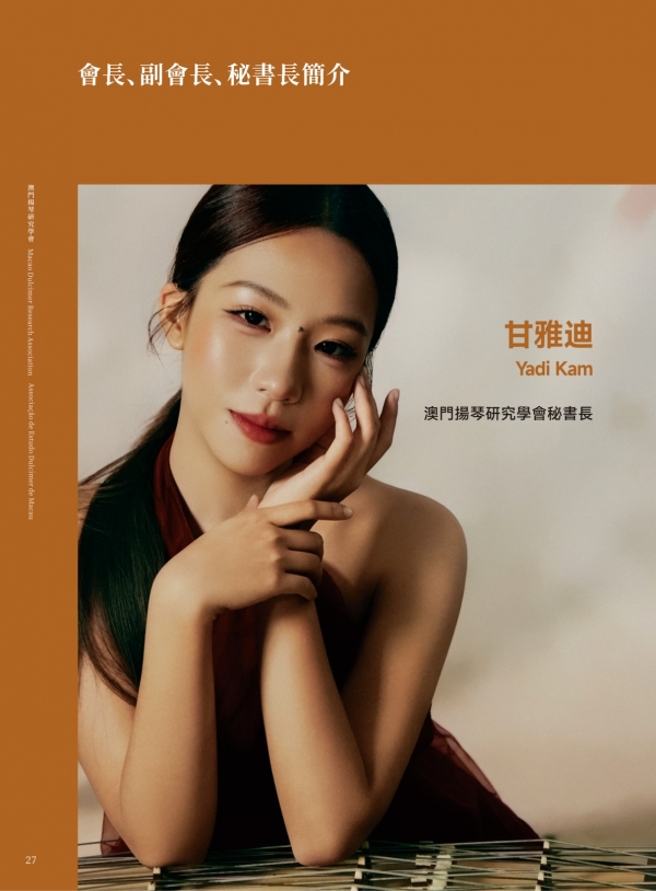 澳门扬琴研究学会成立于 2025 年,为澳门特区正式注册之非营利专业组织,学会章程已刊登于《特区公报》。学会以学术研究与推广扬琴艺术为宗旨,积极投入表演、教学与国际研讨,并设有“澳门芊翩扬琴乐团”为会员提供演出机会。