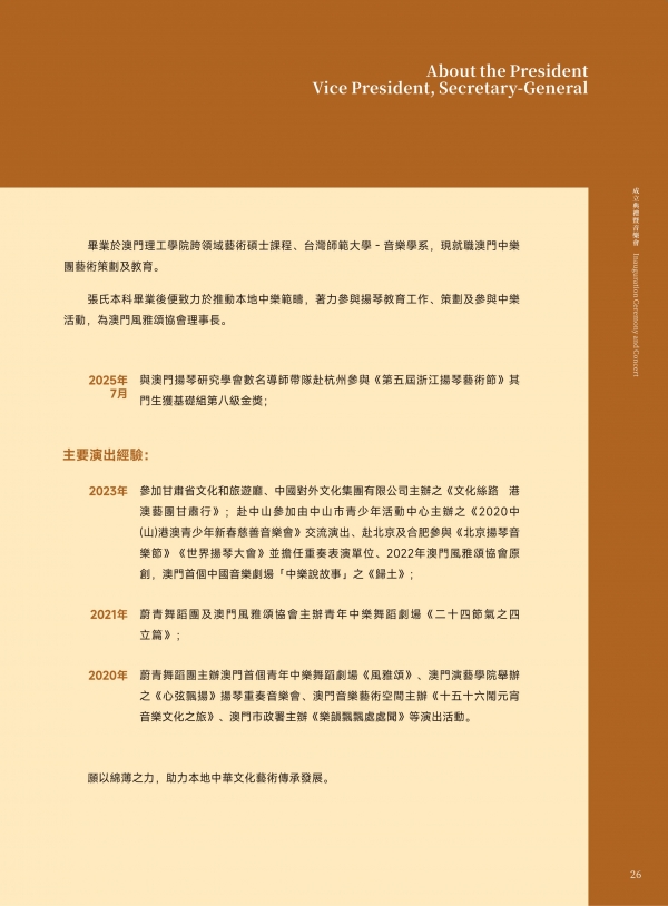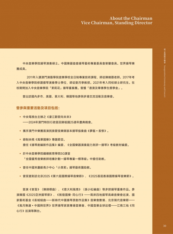 2026年1月25日下午,澳门扬琴研究学会成立典礼暨音乐会在澳门东方基金会(世界文化遗产)顺利举行。活动汇聚了澳门及国内外音乐界权威人士、专家学者和教育工作者。澳门扬琴研究学会的正式成立,开启扬琴艺术在澳门发展的新纪元。
