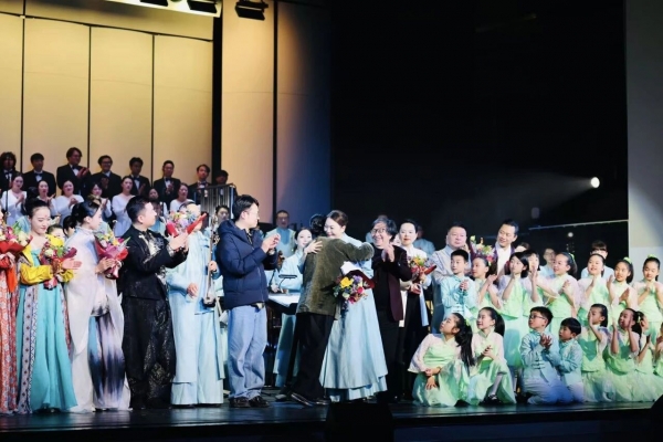 团长罗小慈将乐团阮声部首席刘波请到舞台中央,介绍道:“刘波老师自大学毕业进入上海民族乐团,已经为乐团服务了39年。本场音乐会将是刘波退休前在乐团参加的最后一场音乐会。感谢您39年的坚守和付出。”现场掌声与欢呼声交织在一起,温馨感人。