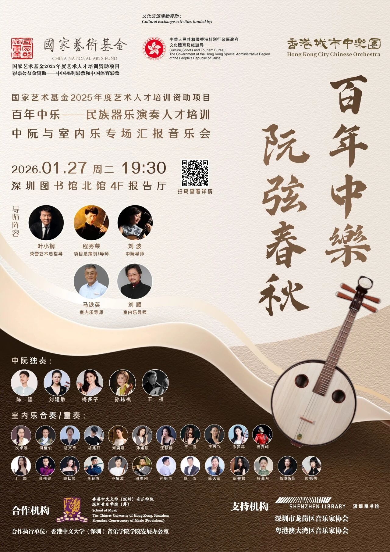 2026年1月27日晚上19:30,中阮及室内乐专场汇报音乐会“百年中乐 阮弦春秋”,将于深圳图书馆北馆4F报告厅盛大上演!