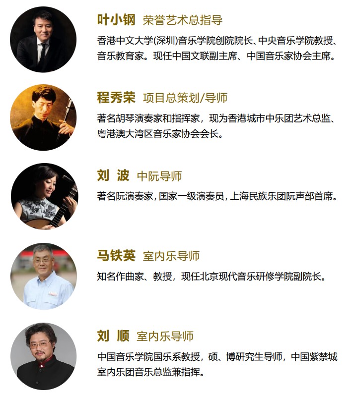 导师阵容本项目由中国音乐家协会主席叶小钢任荣誉艺术总指导,香港城市中乐团艺术总监程秀荣任总策划。