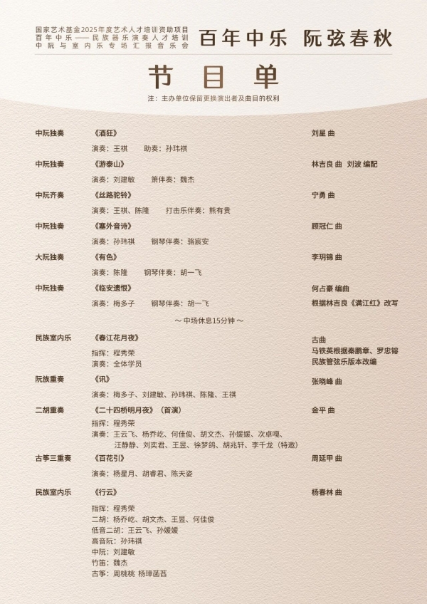 系列音乐会预告国家艺术基金2025年度资助项目《百年中乐——民族器乐演奏人才培训》项目第二期集训系列汇报音乐会共4场: