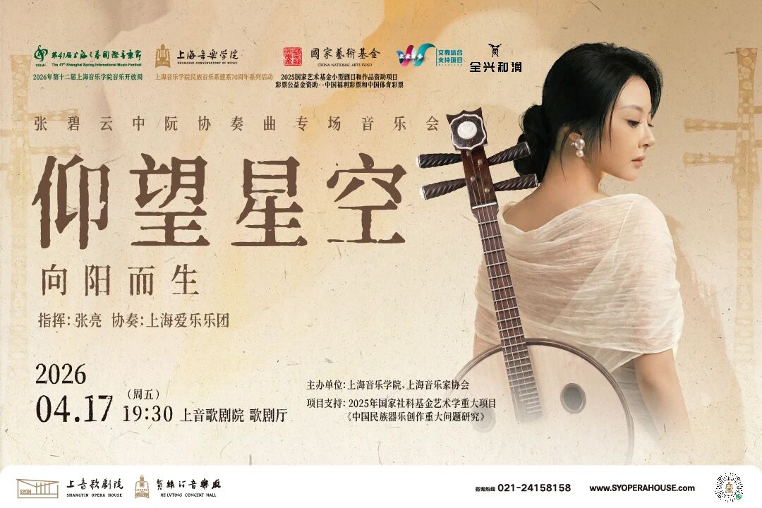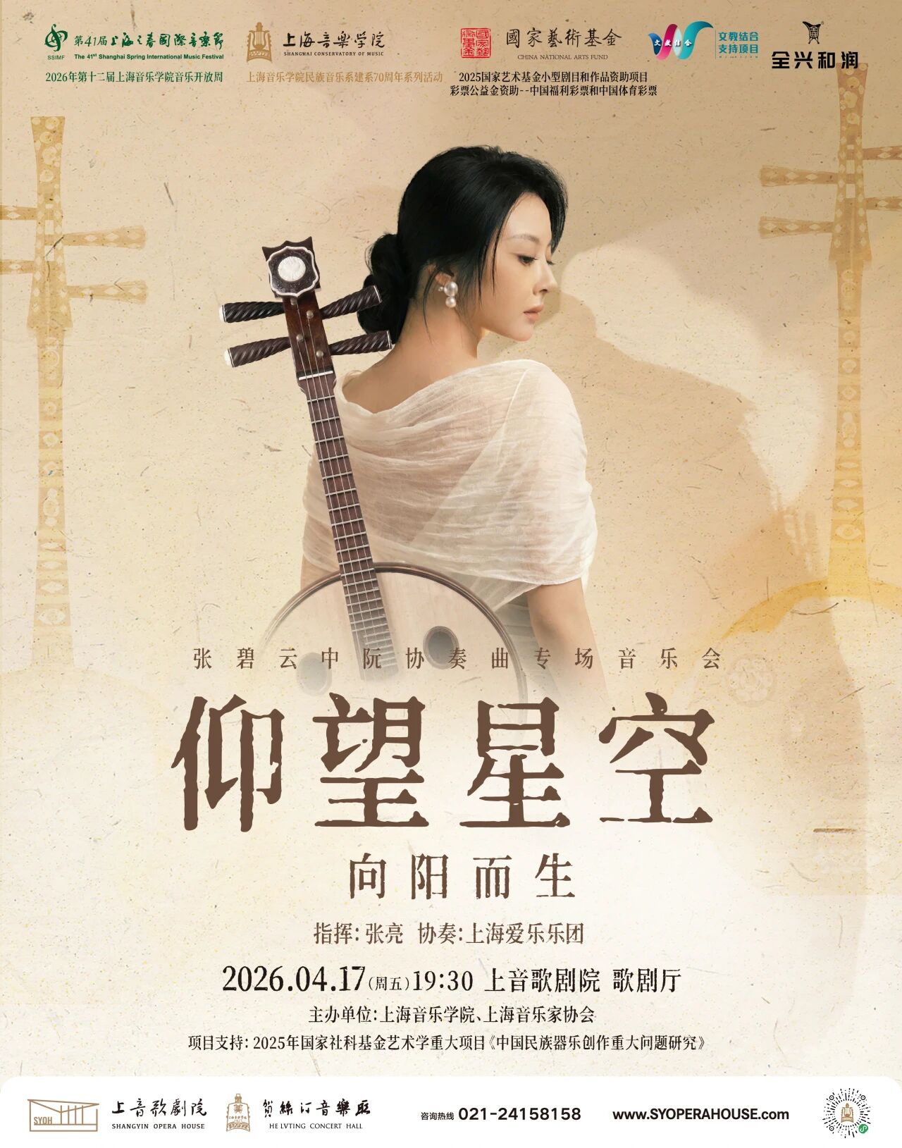 张碧云是当代极具影响力的柳琴、中阮演奏家,上海音乐学院副教授、硕士生导师,全国首位中阮专业博士。在本场音乐会中,她将携手上海爱乐乐团,倾情演绎五部原创中阮协奏曲。作品或描绘浩瀚苍穹,或吟唱丝路传奇,或传递西南山寨的浪漫情意,既有入选国家级创作扶持计划的匠心之作,亦有演奏家自作自演的倾心之笔,集中呈现了当代中阮协奏曲的多元风貌与艺术高度。音乐会以“仰望星空·向阳而生”为主题,张碧云将以细腻的力度控制与深厚的艺术修为,展现中阮圆润而富有穿透力的音色魅力。作为开放周参演项目,带领观众沉浸式感受民族器乐的灵动神韵与中华文化的当代活力。