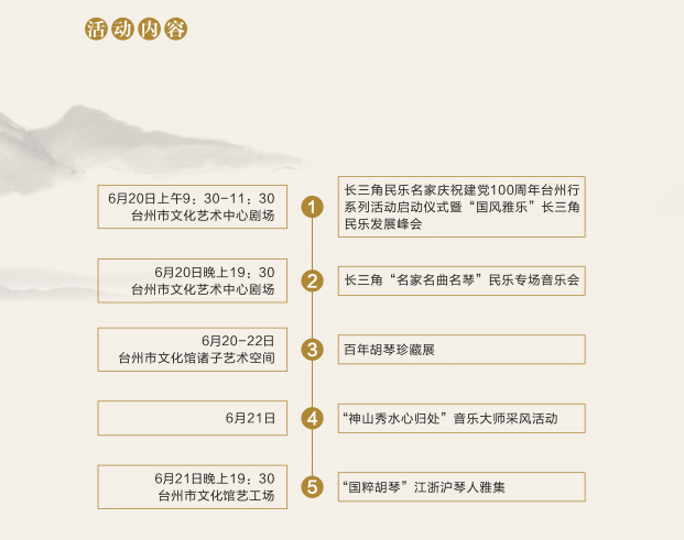 活动包括“国风雅乐”民乐发展峰会、“名家名曲名琴”民乐专场音乐会、百年胡琴珍藏展、音乐采风、琴人雅集等。系列活动将通过无限台州、台州市文化馆视频号等新媒体同步直播,为台州人民献上一场声势浩大的民乐盛宴。
