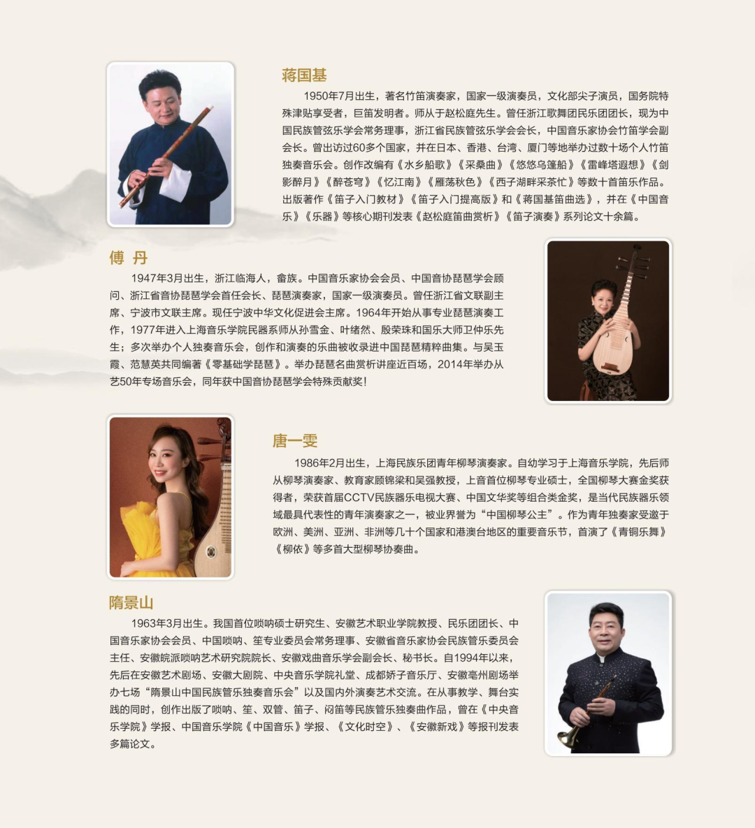 此次系列活动大咖云集,齐聚了赵寒阳、朱晞、翁持更、蒋国基、傅丹、唐一雯、隋景山、张觉平、谢涛等民乐名家。