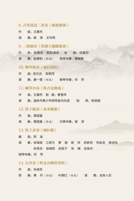 特邀演奏的名家有:国家级非遗项目古琴艺术(虞山琴派)代表性传承人、中国民族器乐学会副会长朱晞古琴独奏《流水》,我国首位唢呐硕士研究生、安徽皖派唢呐艺术研究院院长隋景山笙独奏《秦王破阵乐》,古筝演奏家谢涛独奏《云裳诉》,中央音乐学院民乐系教授、博导赵寒阳二胡独奏《洪湖主题随想曲》,上海民族乐团青年柳琴演奏家唐一雯独奏《雨后庭院》,笛子演奏家、浙江省民族管弦乐学会副会长蒋国基笛子独奏《水乡船歌》,琵琶演奏家傅丹和宁波市歌舞剧院首席琵琶叶晓红领奏《唱支山歌给党听》等。