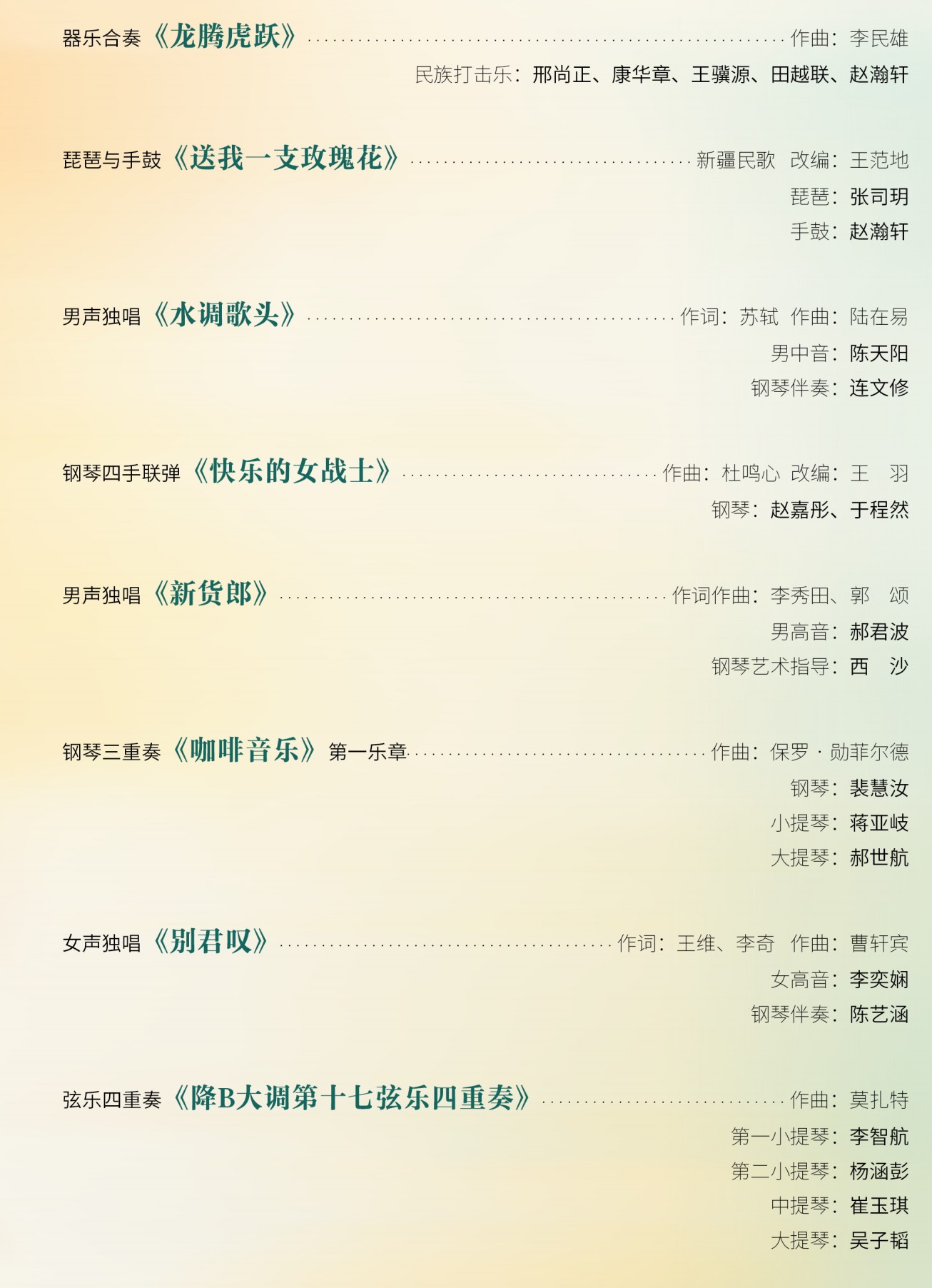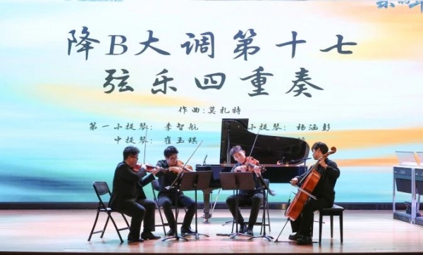 男声独唱《新货郎》是一首充满东北乡土气息的经典民歌,以幽默生动的语言和欢快的旋律塑造了走街串巷的货郎形象,生动地传递出劳动人民朴素的生活智慧与豁达精神。钢琴三重奏《咖啡音乐》第一乐章爵士化的音乐语言营造出慵懒而精致的都市情调,以沙龙音乐的风格勾勒出一幅音画交织的现代都市风情小品。歌曲《别君叹》融合了古典诗词意蕴与现代音乐审美,以女声独唱的形式,通过气声与真声的细腻转换,营造出“此情无计可消除”的缠绵意境。随着弦乐四重奏《降B大调第十七弦乐四重奏》响起,音乐风格从东方诗词的含蓄意境,转向西方古典的理性之美,四件弦乐器对话生动,展现古典时期的优雅与活力。