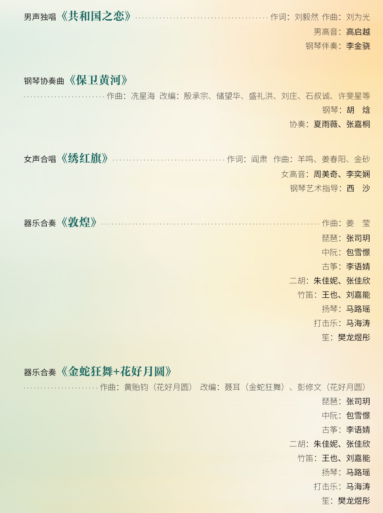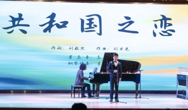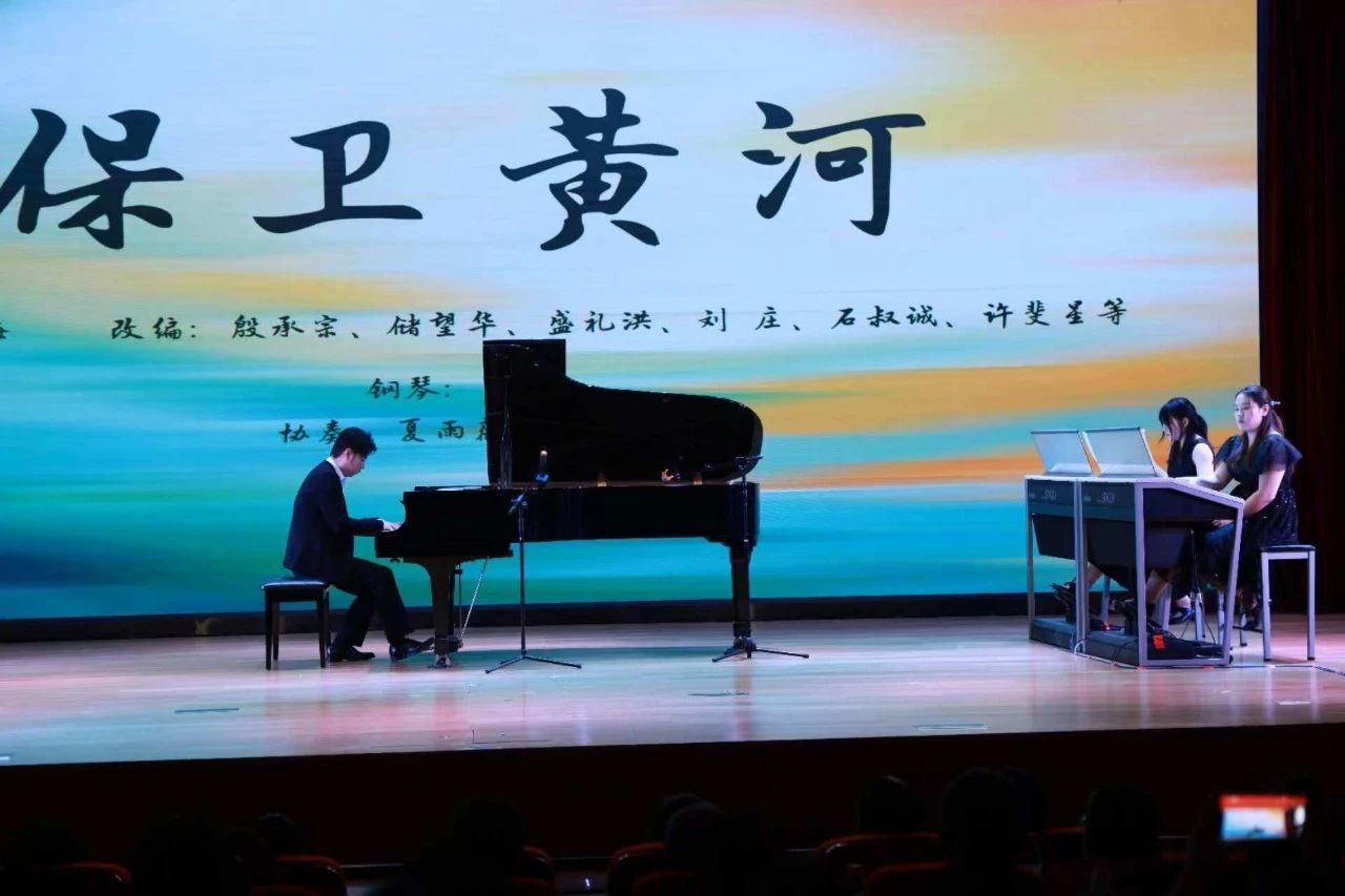 男声独唱《共和国之恋》以恢宏大气的旋律线条,抒发了对祖国母亲的炽热情感,演唱者通过浑厚的音色与渐强渐弱的细腻处理,在“纵然是凄风苦雨,我也不会离你而去”等歌词中,将个人命运与家国情怀完美交融。钢琴协奏曲《保卫黄河》以冼星海同名合唱曲为基调,通过恢宏的钢琴语言与交响化的戏剧冲突,再现中华民族不屈的抗争精神,讴歌了中华儿女的英勇斗志。女声合唱《绣红旗》以细腻婉转的多声部织体,艺术化再现了革命年代的血色浪漫。器乐合奏《敦煌》巧妙地将琵琶的轮指、二胡的滑音等民族技法与西方管弦乐织体融合,丰富的音色层次再现了丝路古道的千年神韵,既复活了壁画中的飞天乐舞,又以现代复调手法完成时空对话。