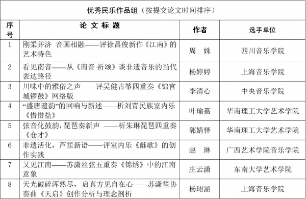 为深入学习实践习近平文化思想,推动中华优秀传统文化创造性转化、创新性发展,把中华优秀传统文化融入艺术教育、社会生活、立德树人的全过程,切实推进新时代中国民族音乐理论评论事业的建设,由中国民族管弦乐学会、山东大学艺术学院、《音乐周报》联合主办,中国民族管弦乐学会理论评论委员会与山东大学艺术学院联合承办了“第五届华乐杯民族器乐作品评论征文”活动。目前论文初审工作已完成,经7位音乐理论专家认真评议,现推选两个组别的16篇论文进入终评环节。