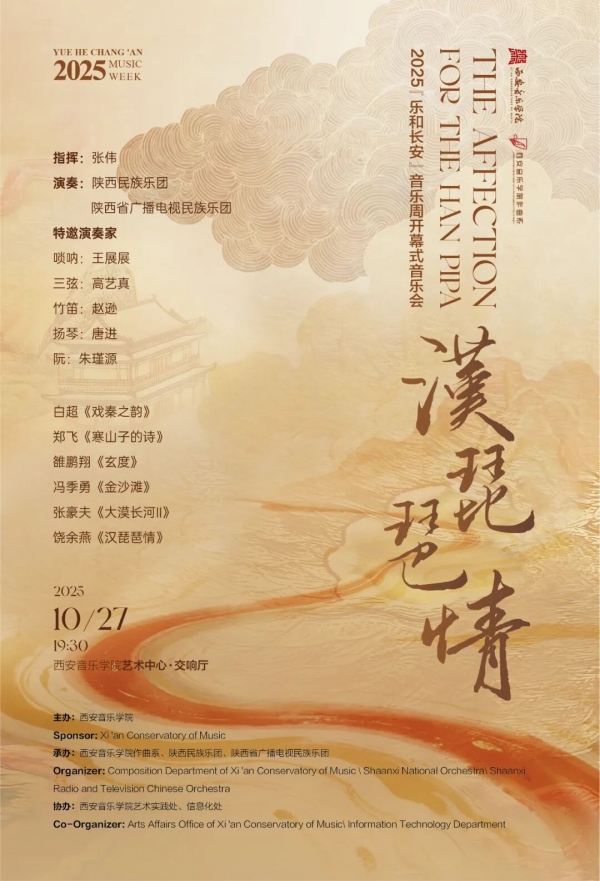 2025年10月27日晚,由西安音乐学院主办,西安音乐学院作曲系、陕西民族乐团、陕西省广播电视乐团承办的“2025乐和长安音乐周开幕式音乐会——《汉琵琶情》”在西安音乐学院艺术中心交响厅隆重举行。
