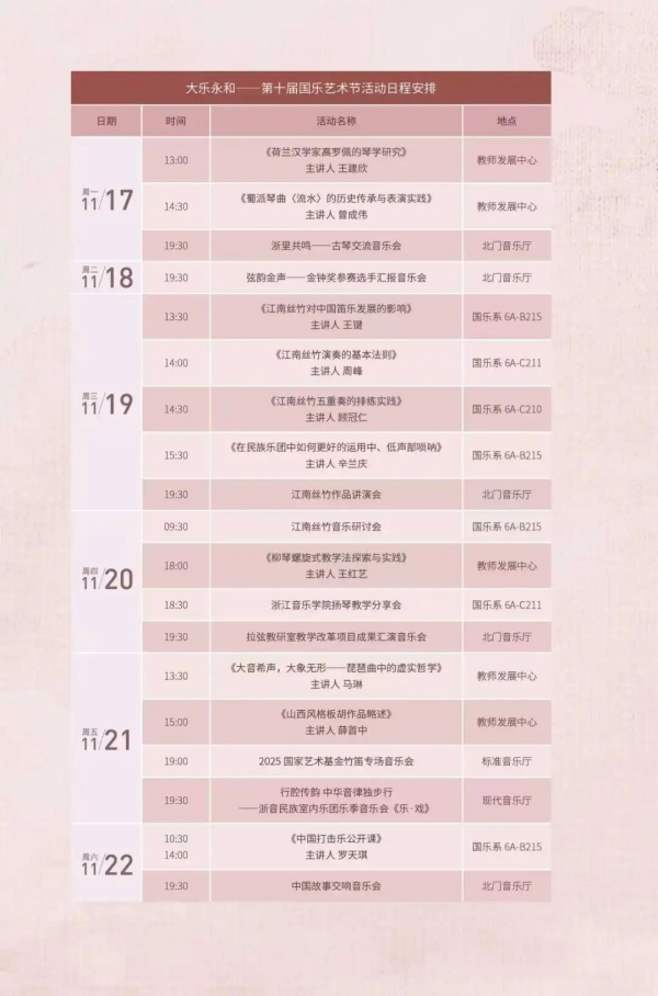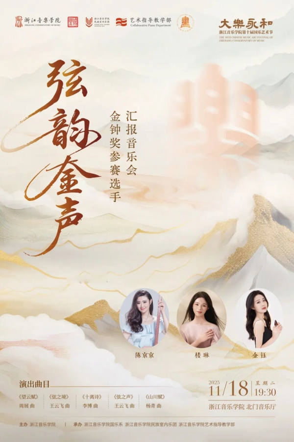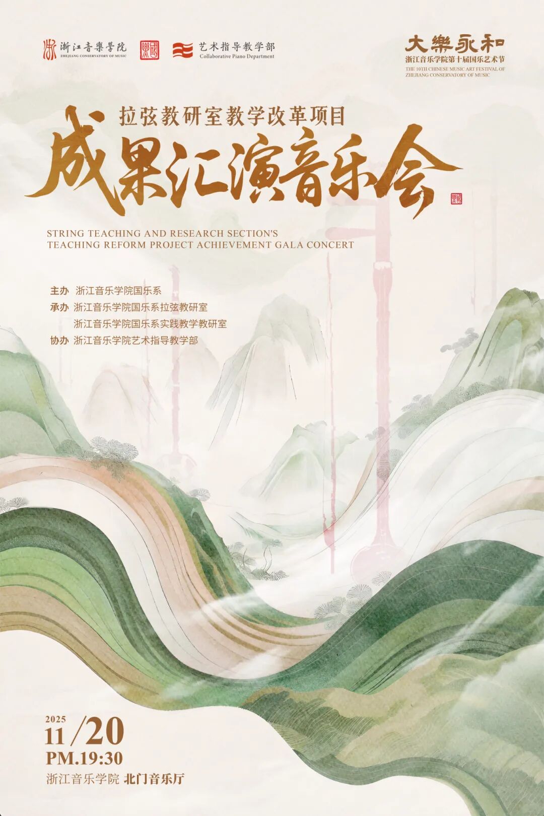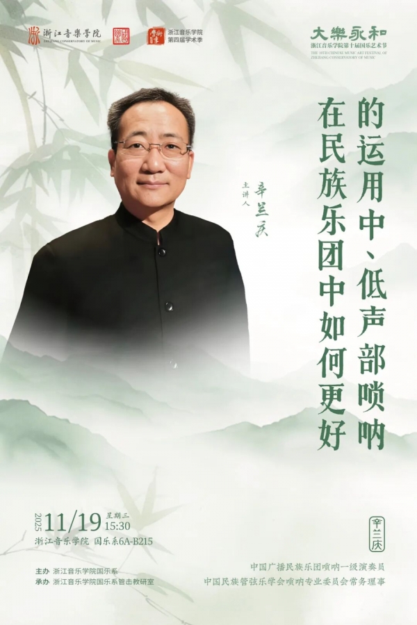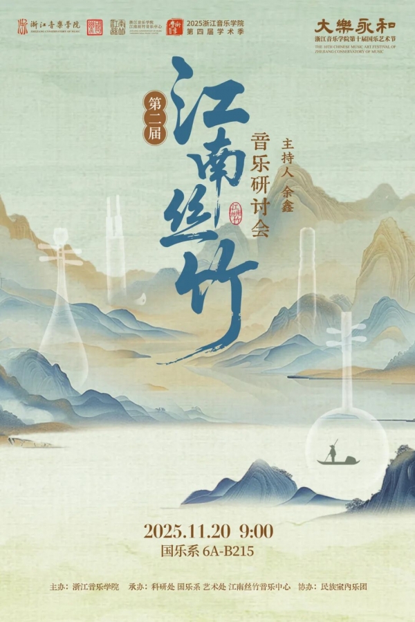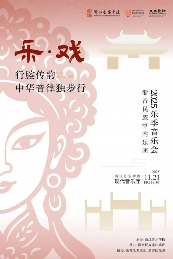 为传承中华优秀传统文化、推动中国民族音乐高质量发展,由浙江音乐学院主办,国乐系承办,艺术处、科研处、教务处、民族室内乐团、艺术指导教学部、音乐工程系共同协办的浙江音乐学院第十届国乐艺术节,于2025年11月17日至22日举办。