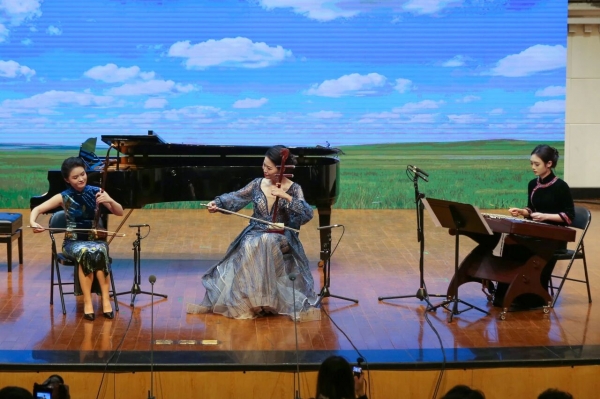 二胡与马骨胡合奏《赛马》(黄海怀作曲)由哈尔滨音乐学院民乐系教师吴秋樾与广西艺术学院二胡教师胡柳默契配合(扬琴伴奏:陈怡),北方二胡的醇厚与南方马骨胡的清亮碰撞交织,伴以扬琴的悠扬,将草原赛马的激昂场面生动还原,紧凑的节奏与激昂的旋律让观众仿佛置身赛场,心随乐动。