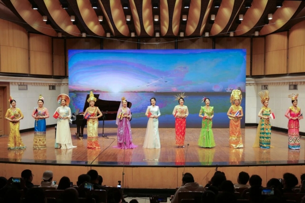 音乐会以广西民歌联唱拉开帷幕,马山壮族“三顿欢”《恩情广朗朗》、环江毛南族“柳啷咧”《迎客歌》、富川瑶族“蝴蝶歌”《富川美》、融水苗族改编民歌《敬酒歌》、侗族琵琶歌《萨文化》依次唱响,广西艺术学院卓越艺术人才培养计划“广西民歌传承与创新人才培养”班学员们以原汁原味的广西民歌唱腔和饱满的情感,将八桂大地民族音乐的独特魅力展现得淋漓尽致,让现场观众瞬间沉浸在南方民族音乐的灵动韵律中。